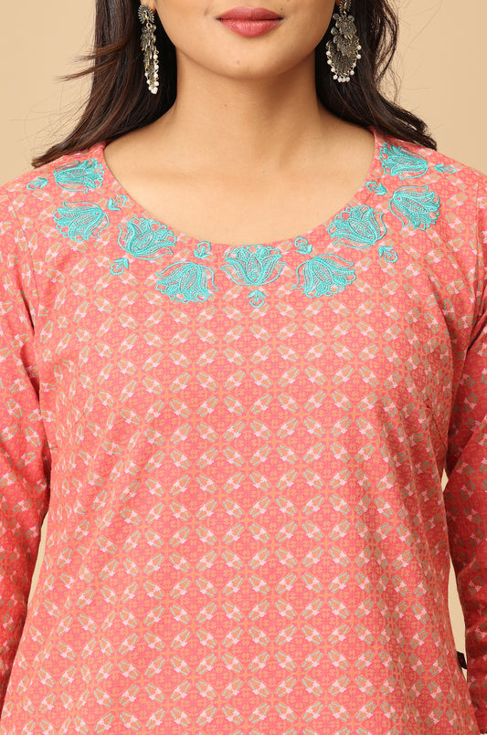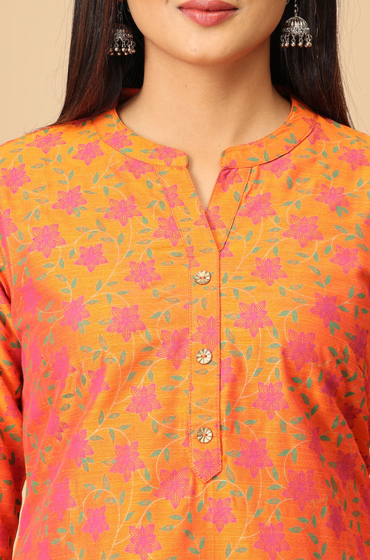 Orange Rayon Slub Printed A-Line Kurti Set - 2Pcs