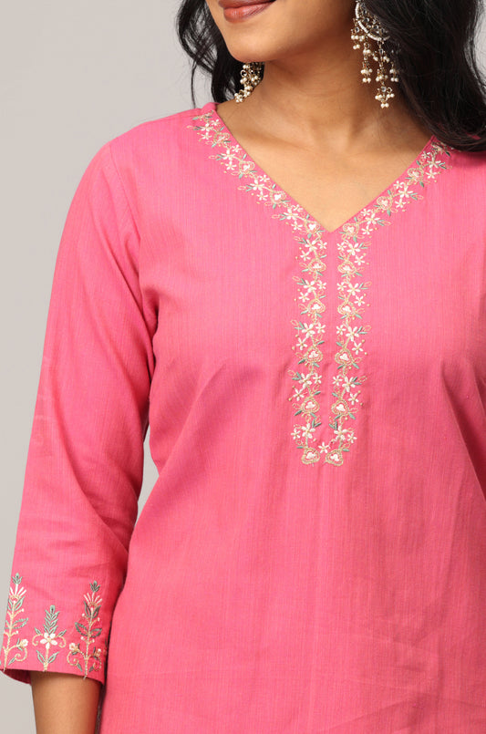 Dark Pink Cotton V Neck Embroidery Kurti Set -2 Pcs