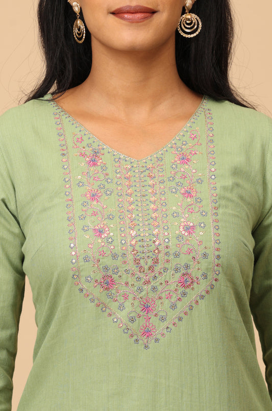 Green Cotton Sequence Embroidery Straight Kurti