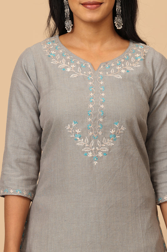 Grey Cotton Neck Embroidered Straight Kurti Set 2 Pcs