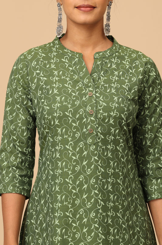 Green Cotton Slub Printed Kurti Set 2 Pcs