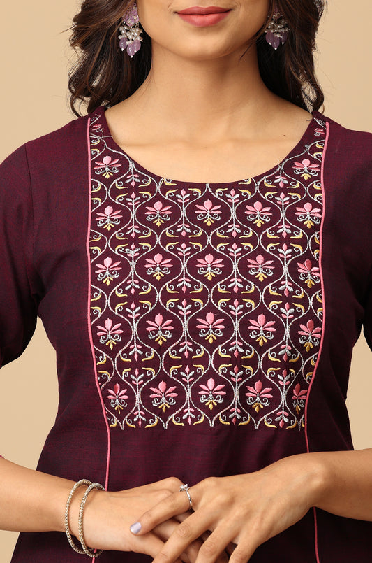 Magenta Slub Silk Embroidery Straight Kurti Set - 2Pcs