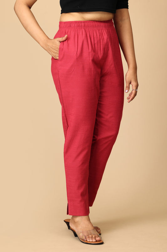 Magenta Rayon Slub Trouser Fit with Drawstring Cigarette Pant