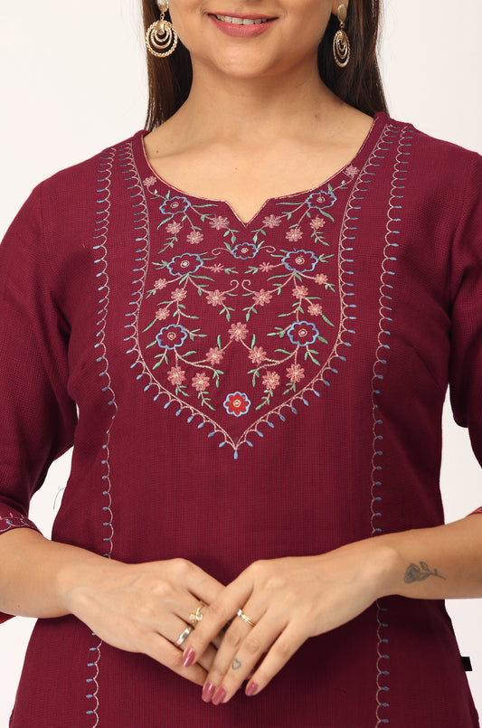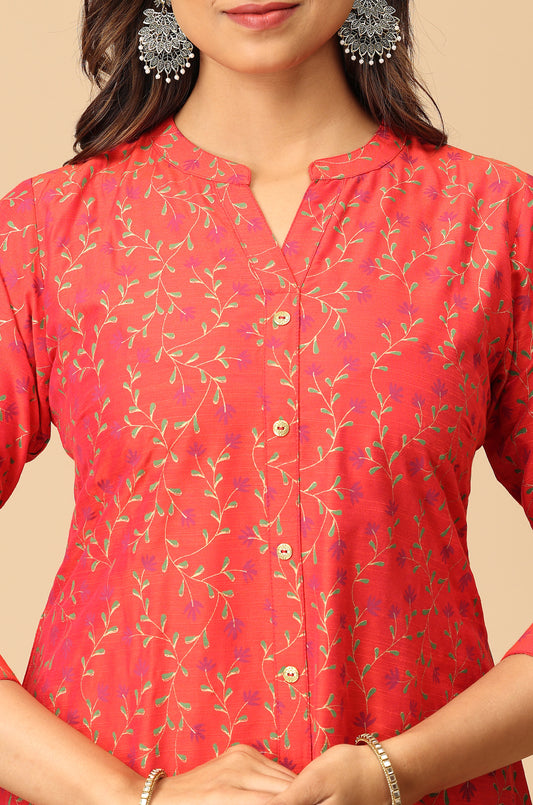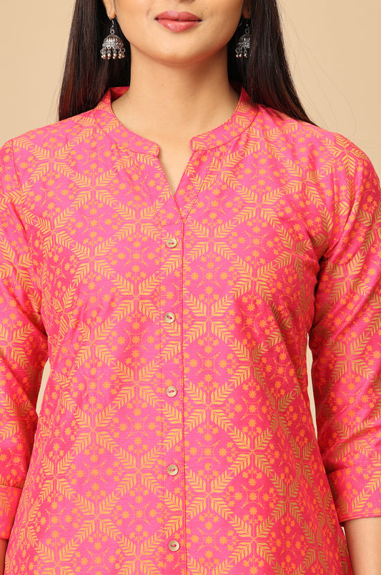 Magenta Slub Silk Printed A-Line Kurti Set - 2Pcs
