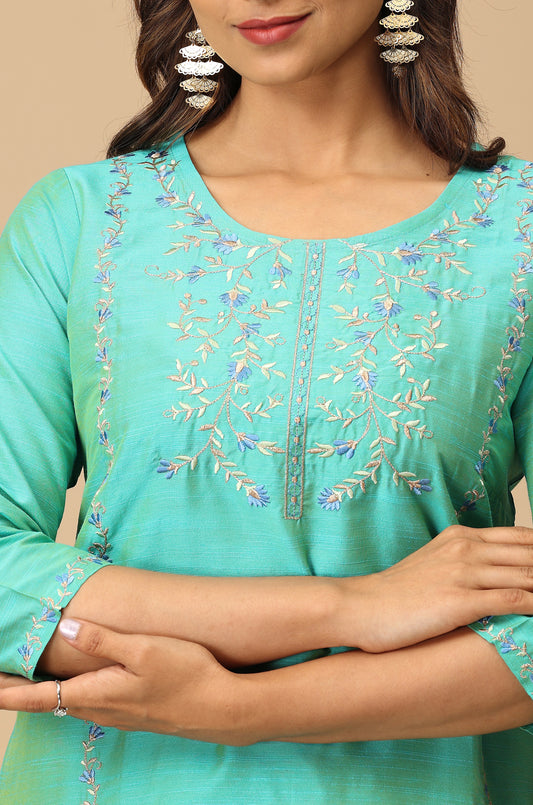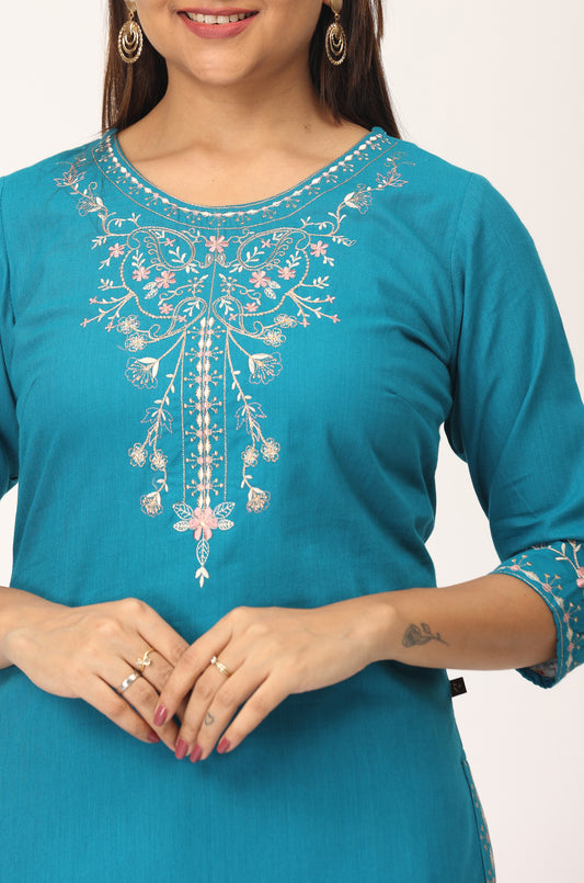 Teal Cotton Printed with Embroidery Straight Kurti Set -3Pcs