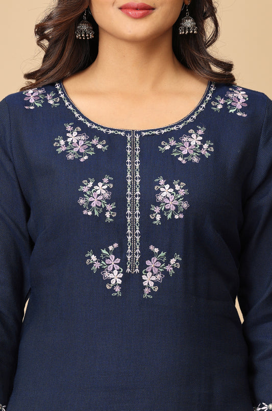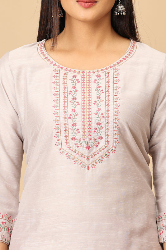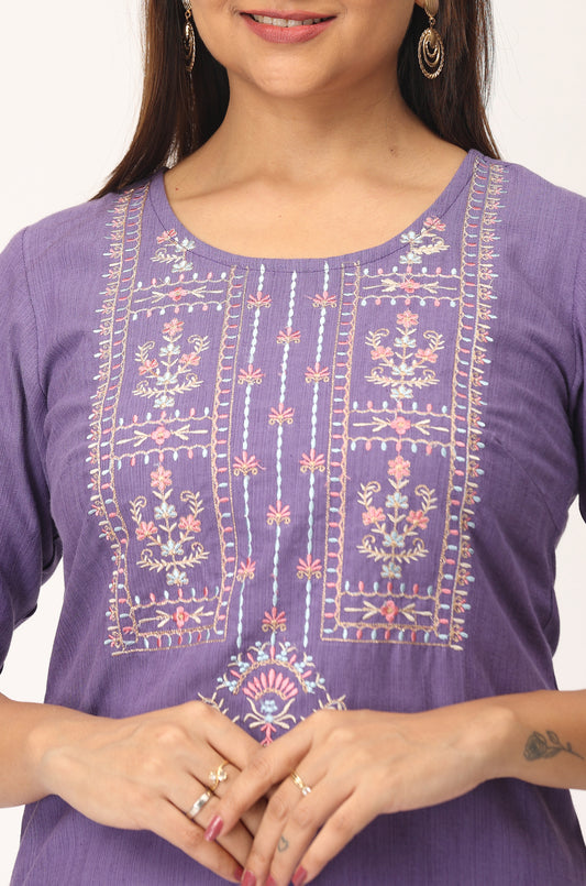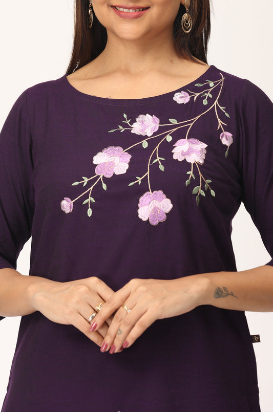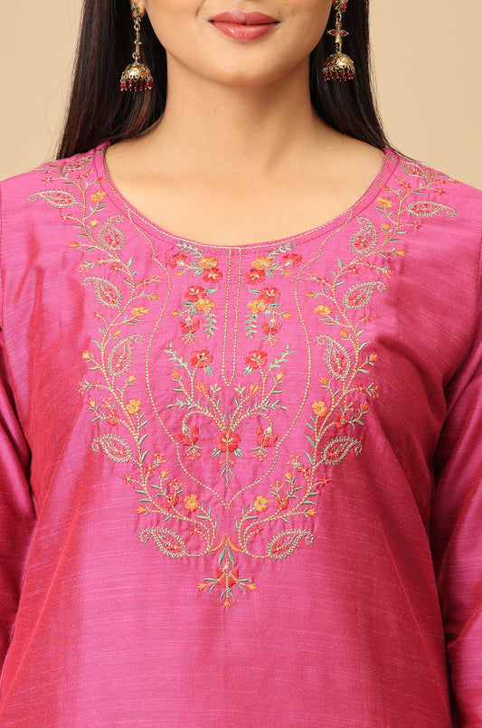 Magenta Slub Silk Embroidery Straight Kurti Set - 2Pcs