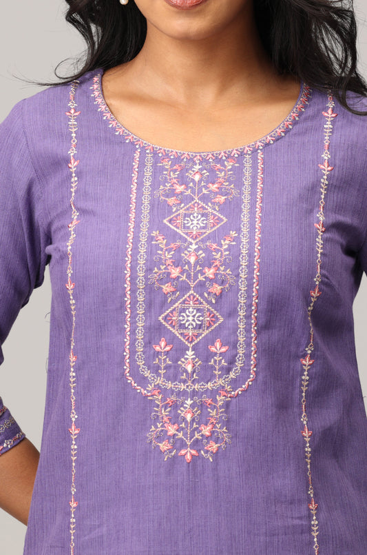 Purple Cotton Embroidered Straight Kurti Set 2 Pcs