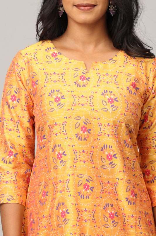 Mustard Slub Silk Floral Printed A-Line Kurti Set 2 Pcs