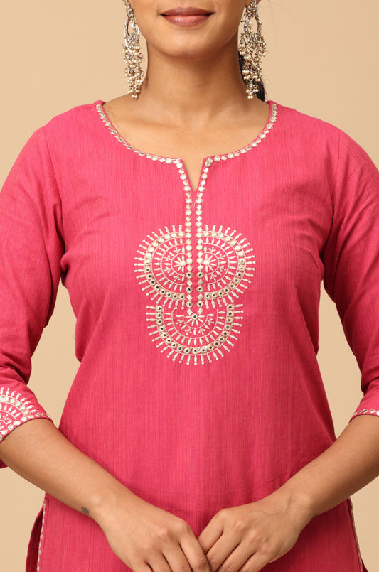 Dark Pink Cotton V Neck Embroidery Kurti Set -2 Pcs