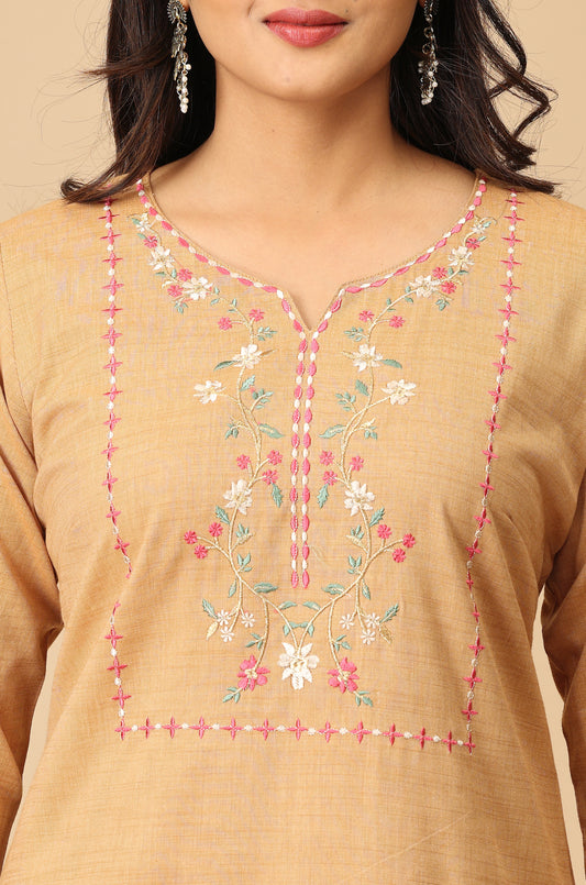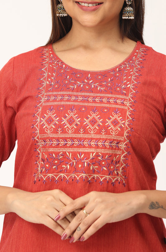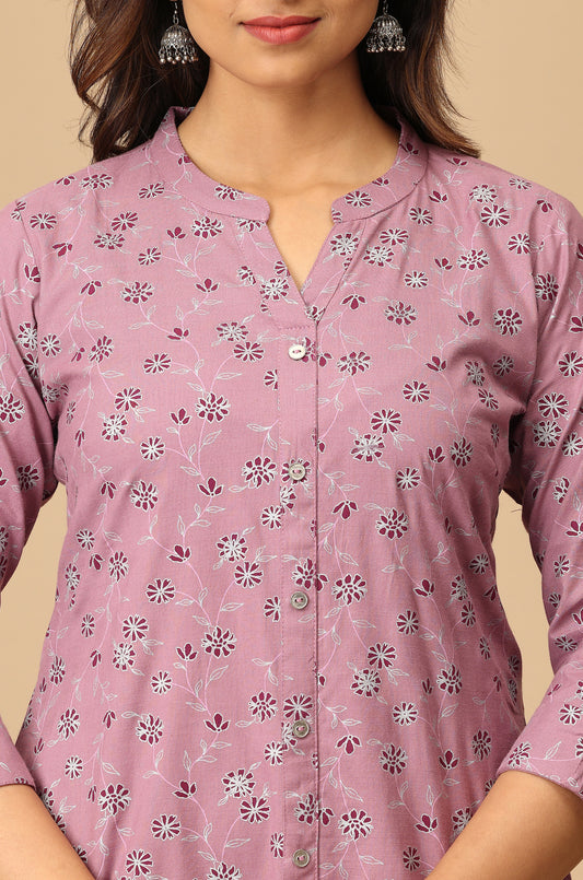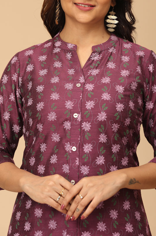 Dark Mauve Slub Silk Printed A-Line Kurti