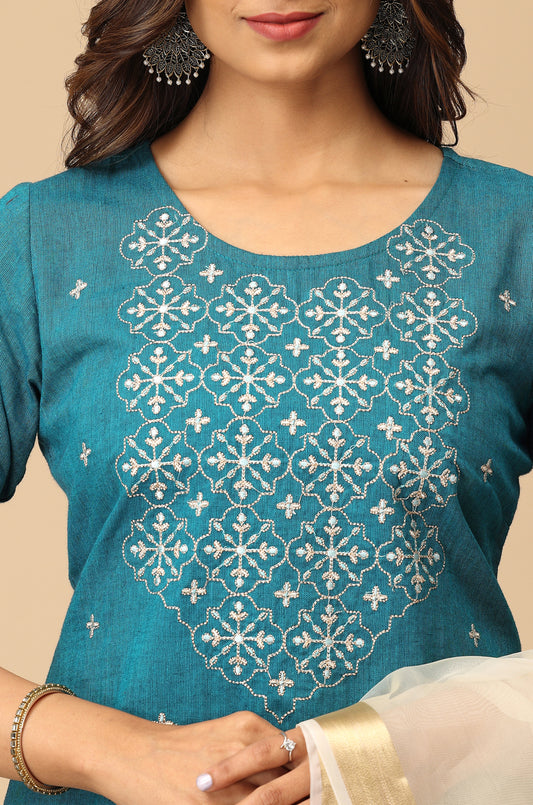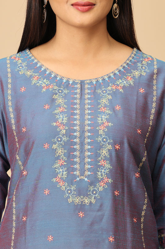 Blue Slub Silk Straight Embroidery Kurti