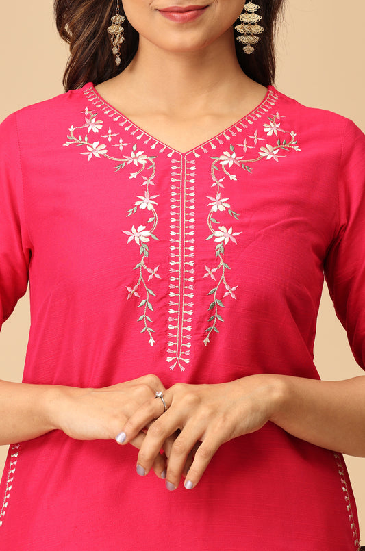 Bright Pink Slub Silk Embroidery Kurti