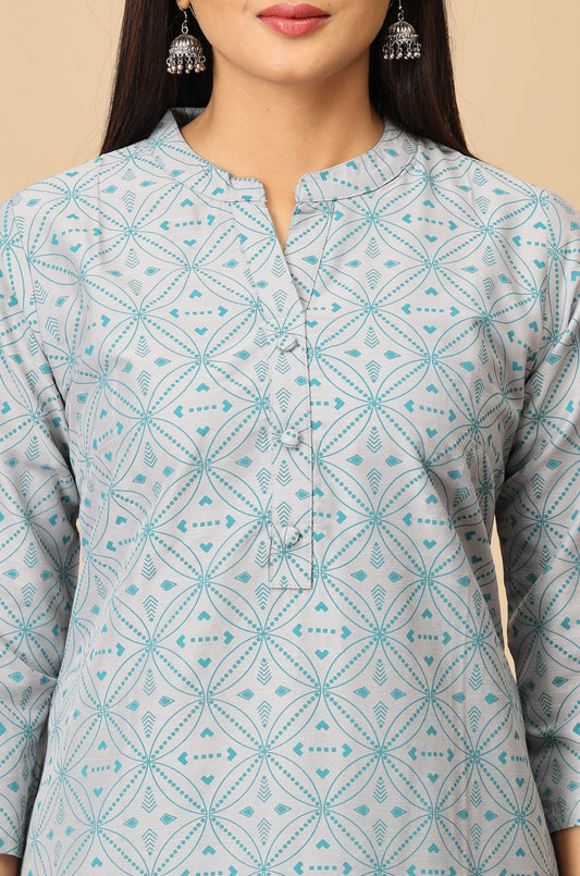 Grey Slub Silk Printed Kurti