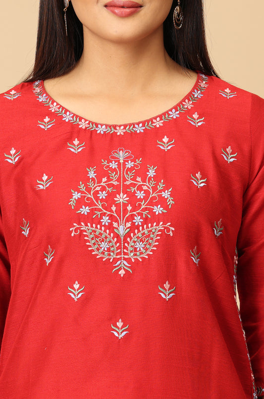 Maroon Slub Silk Embroidery Kurti