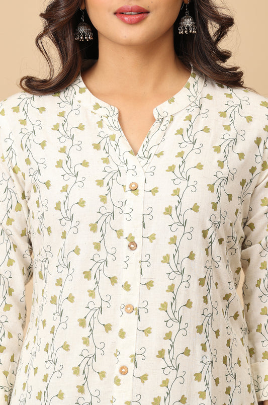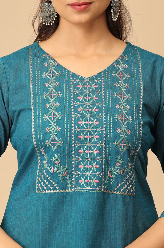 Steel Blue Rayon Slub Box Pleat Printed Kurti