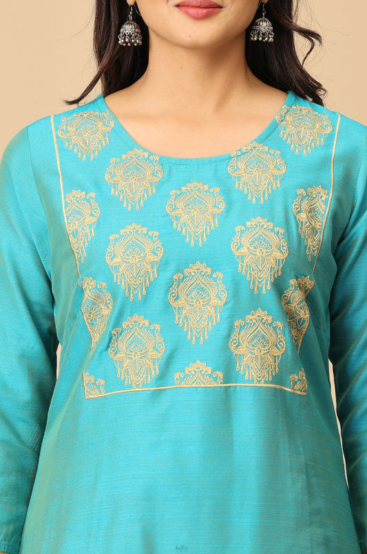 Teal Slub Silk All Over Embroidery Kurti