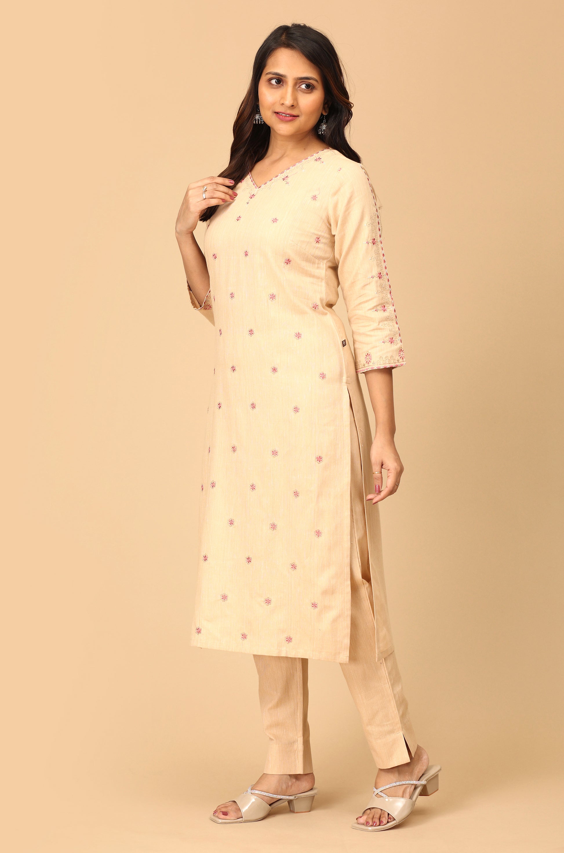 Beige Khadi All over Embroidery Straight Kurti Set - 2Pcs