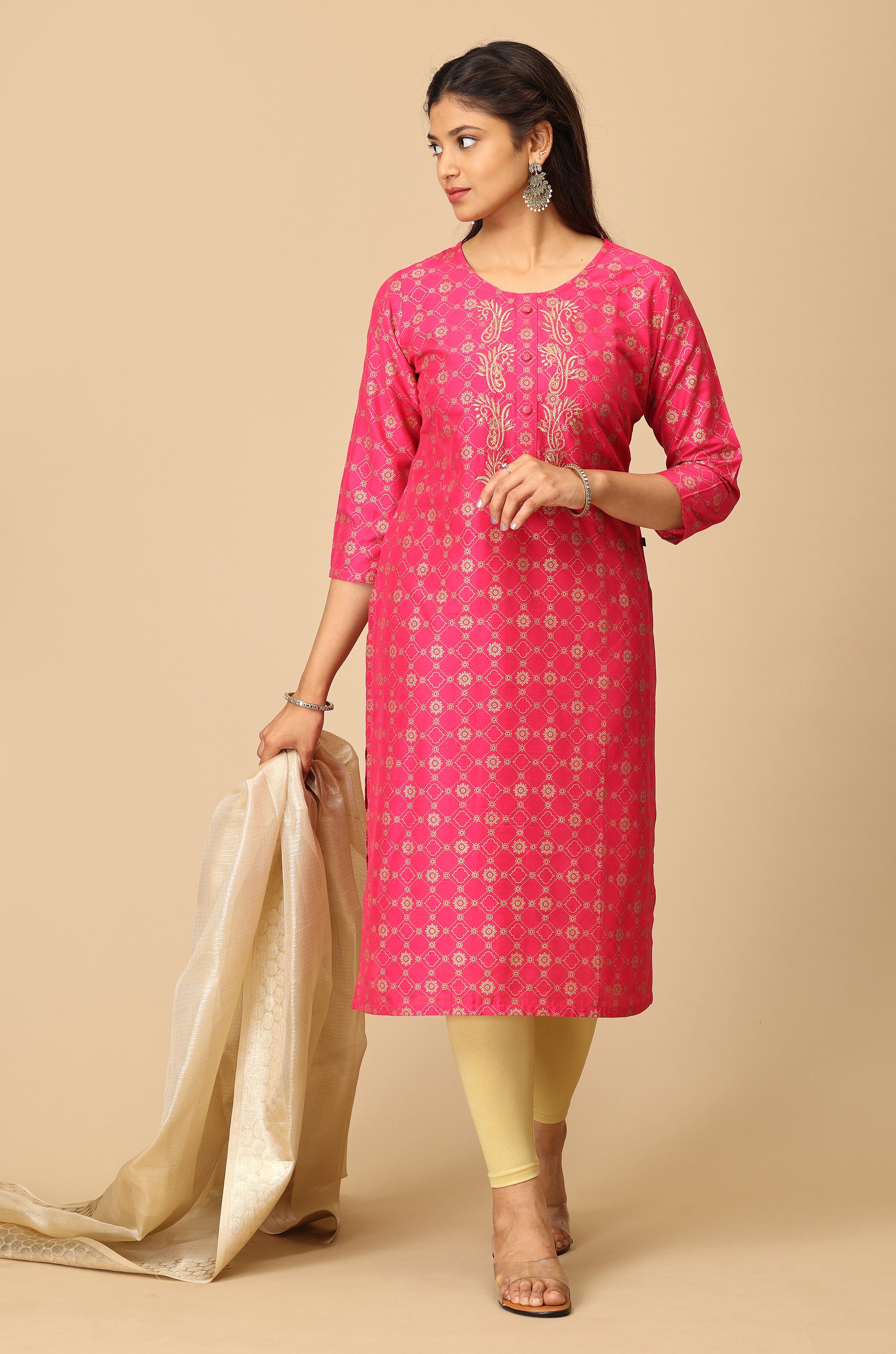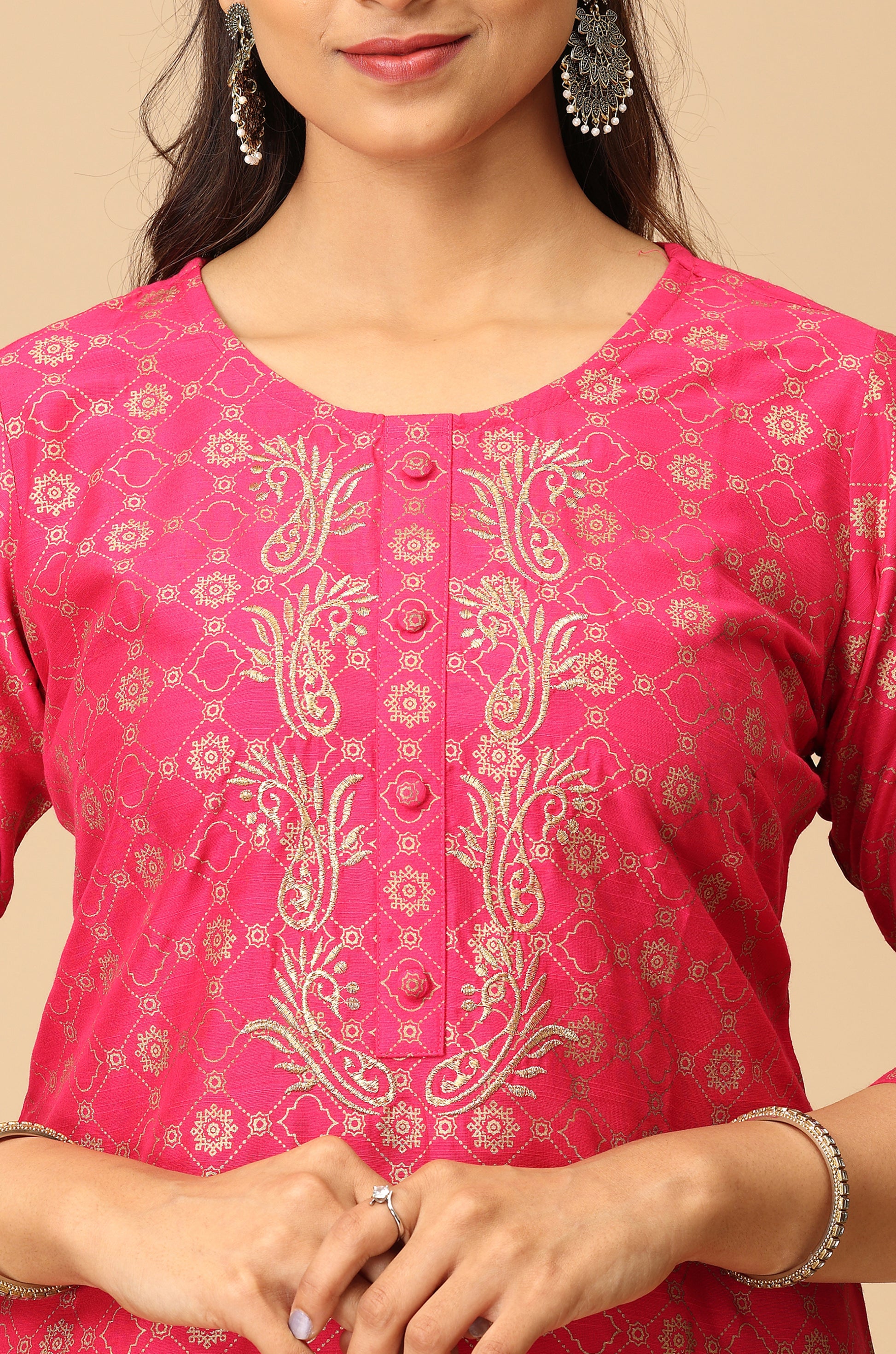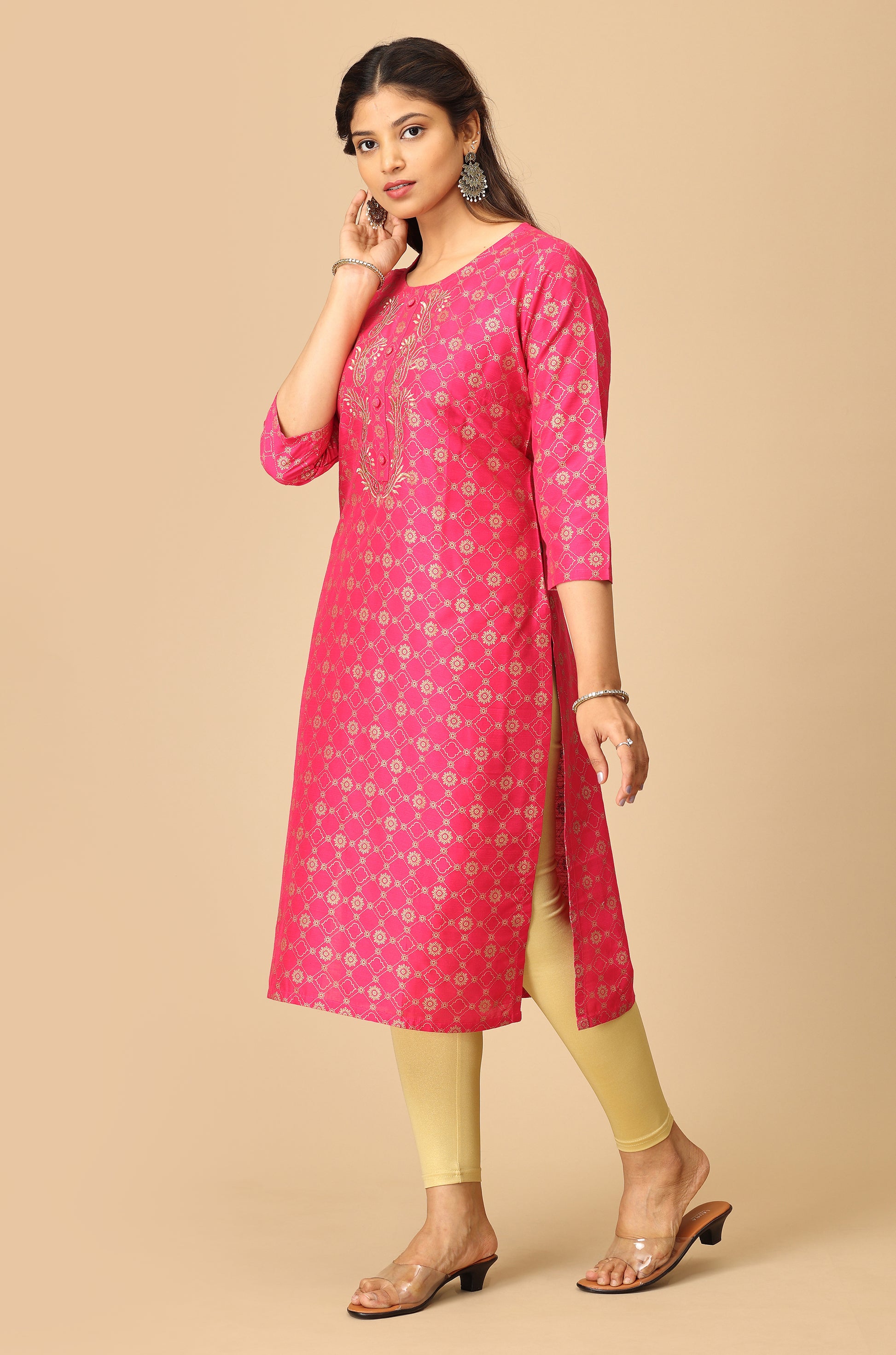 Bright Pink Gold Print with Zari Embroidery Kurti