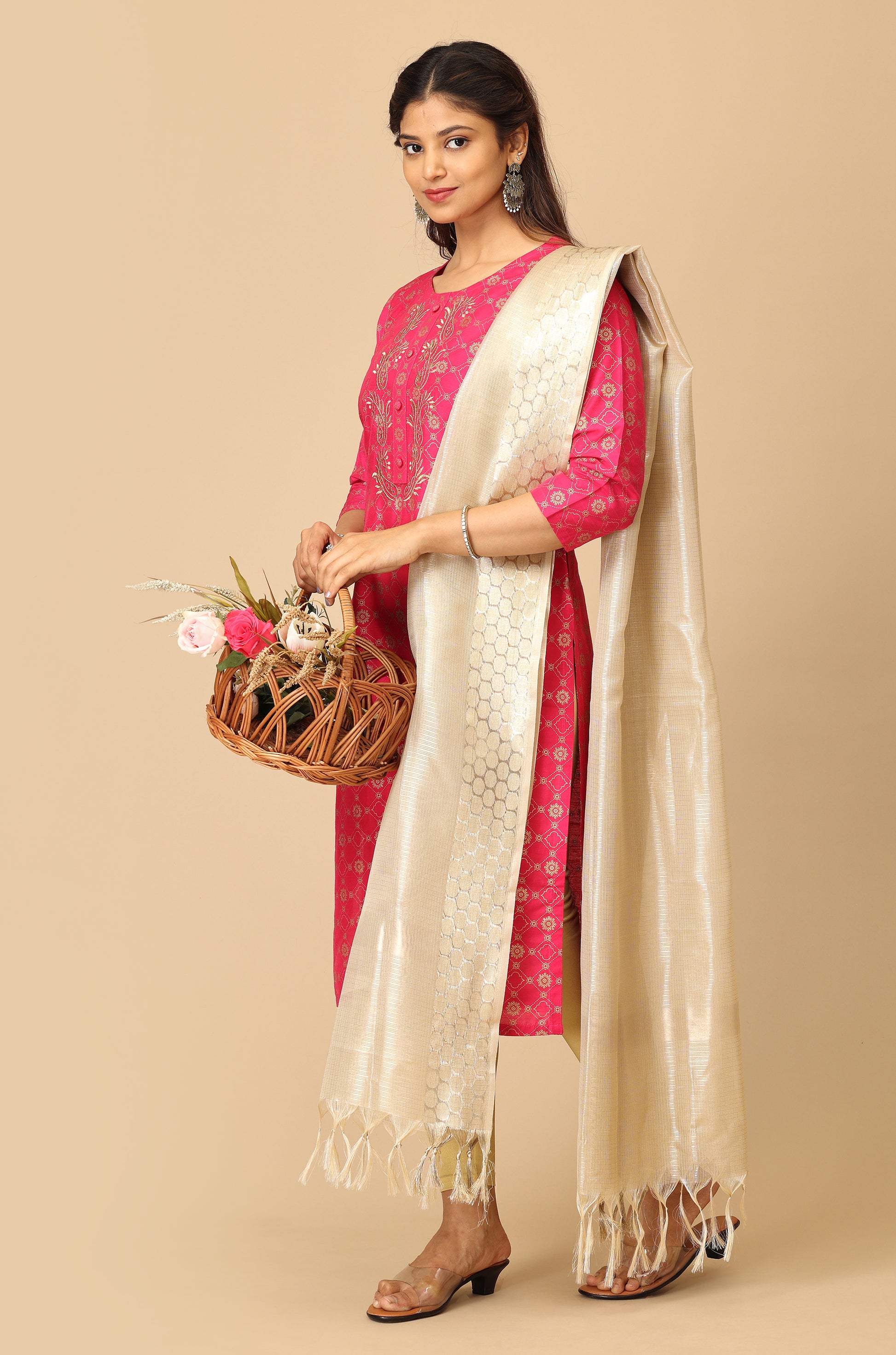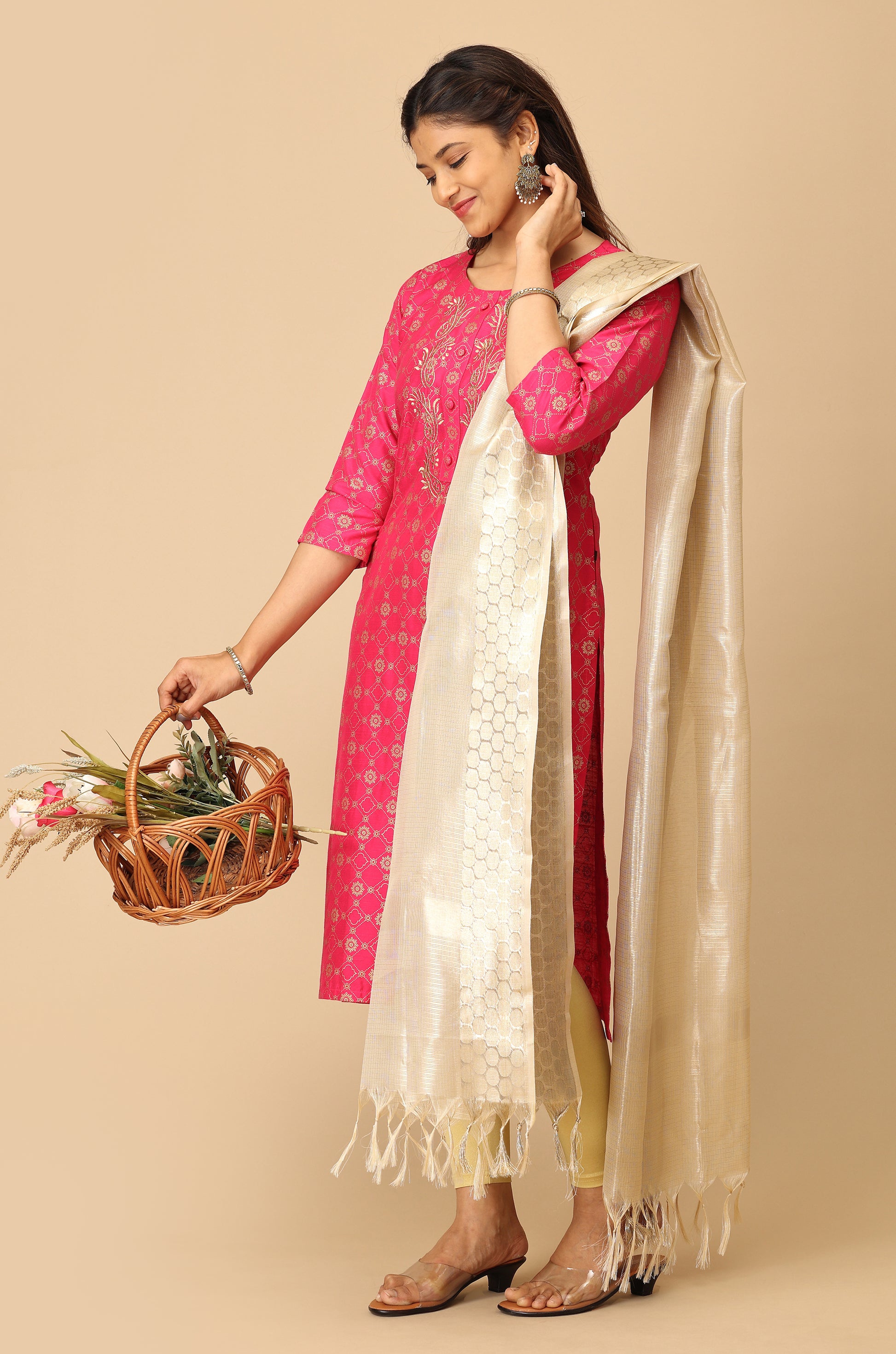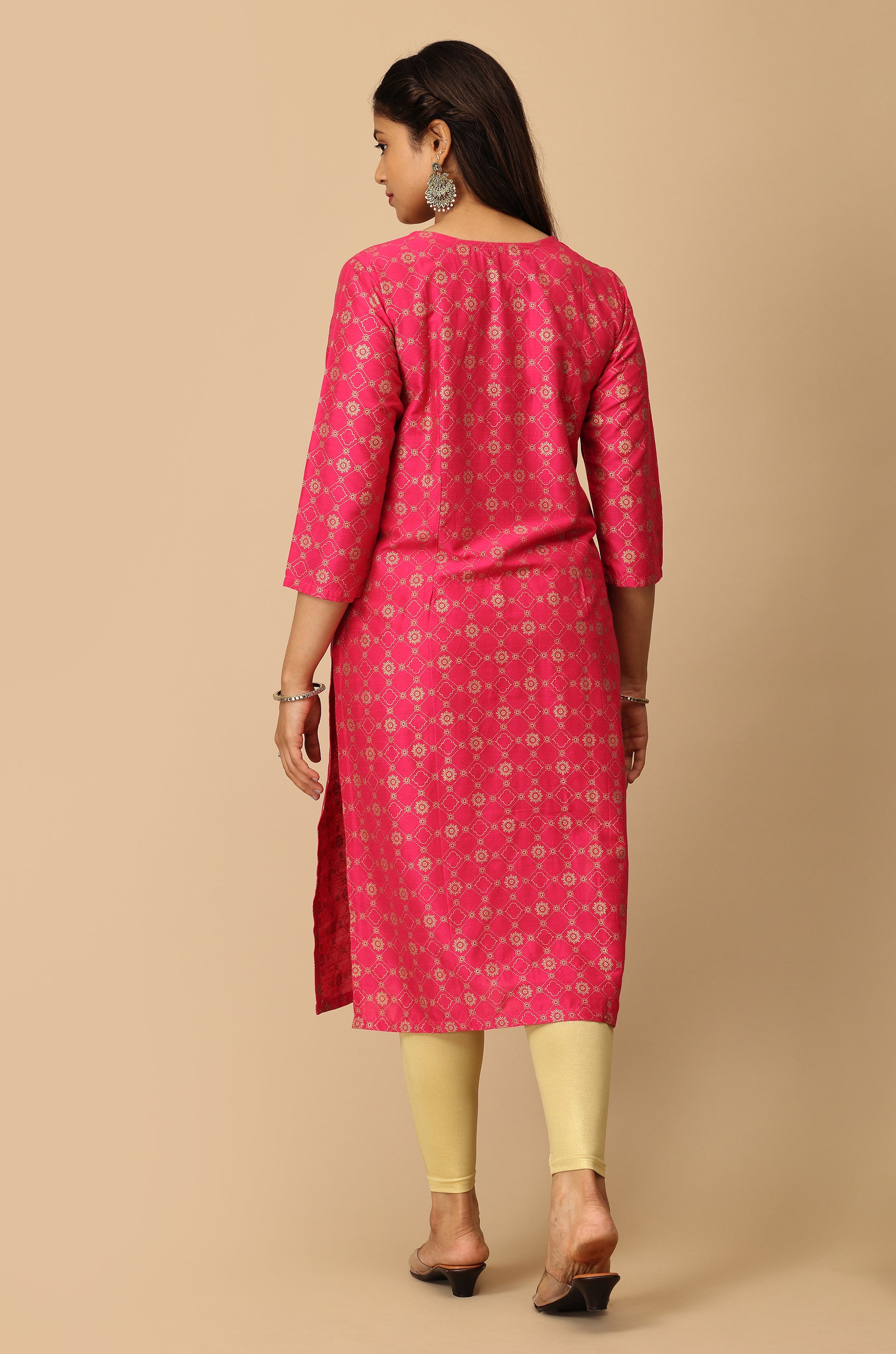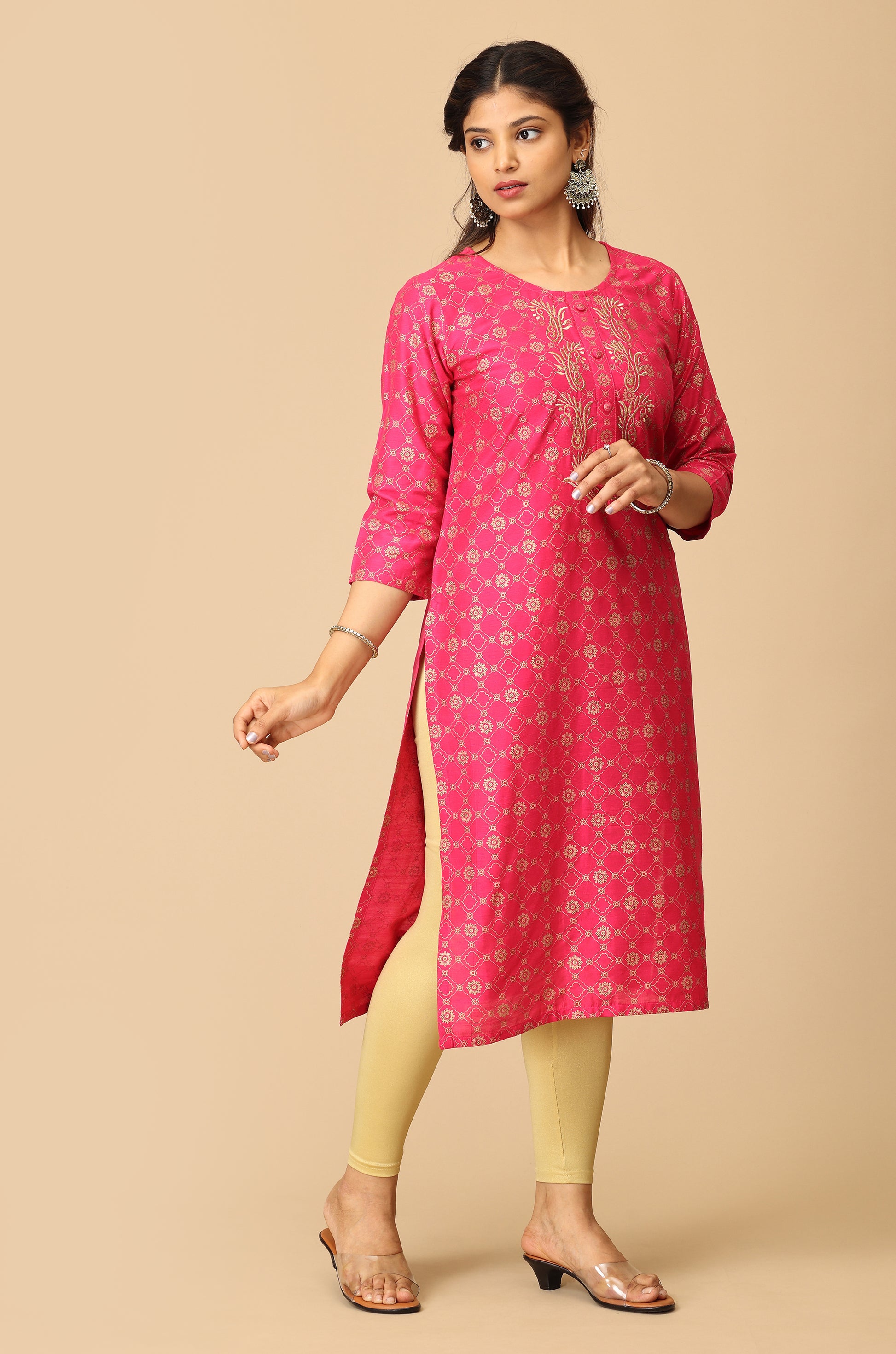 Bright Pink Gold Print with Zari Embroidery Kurti