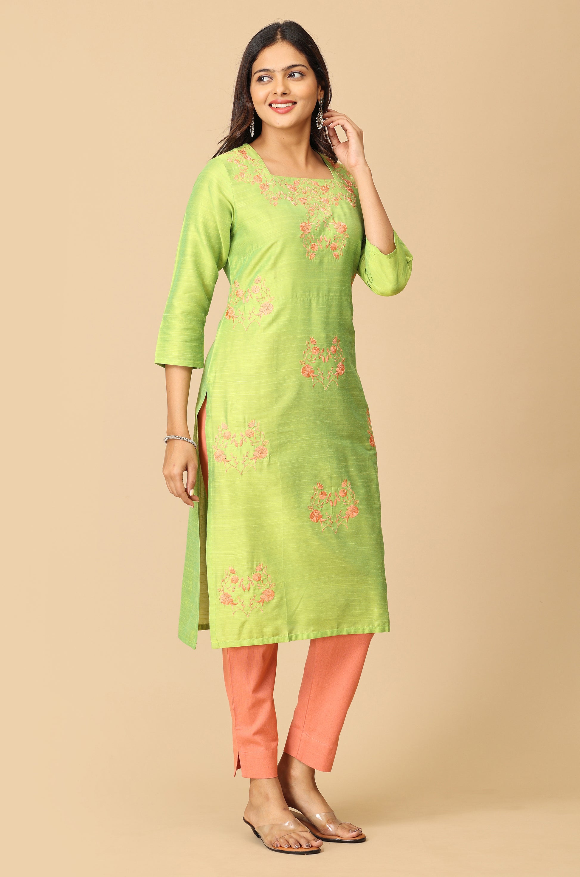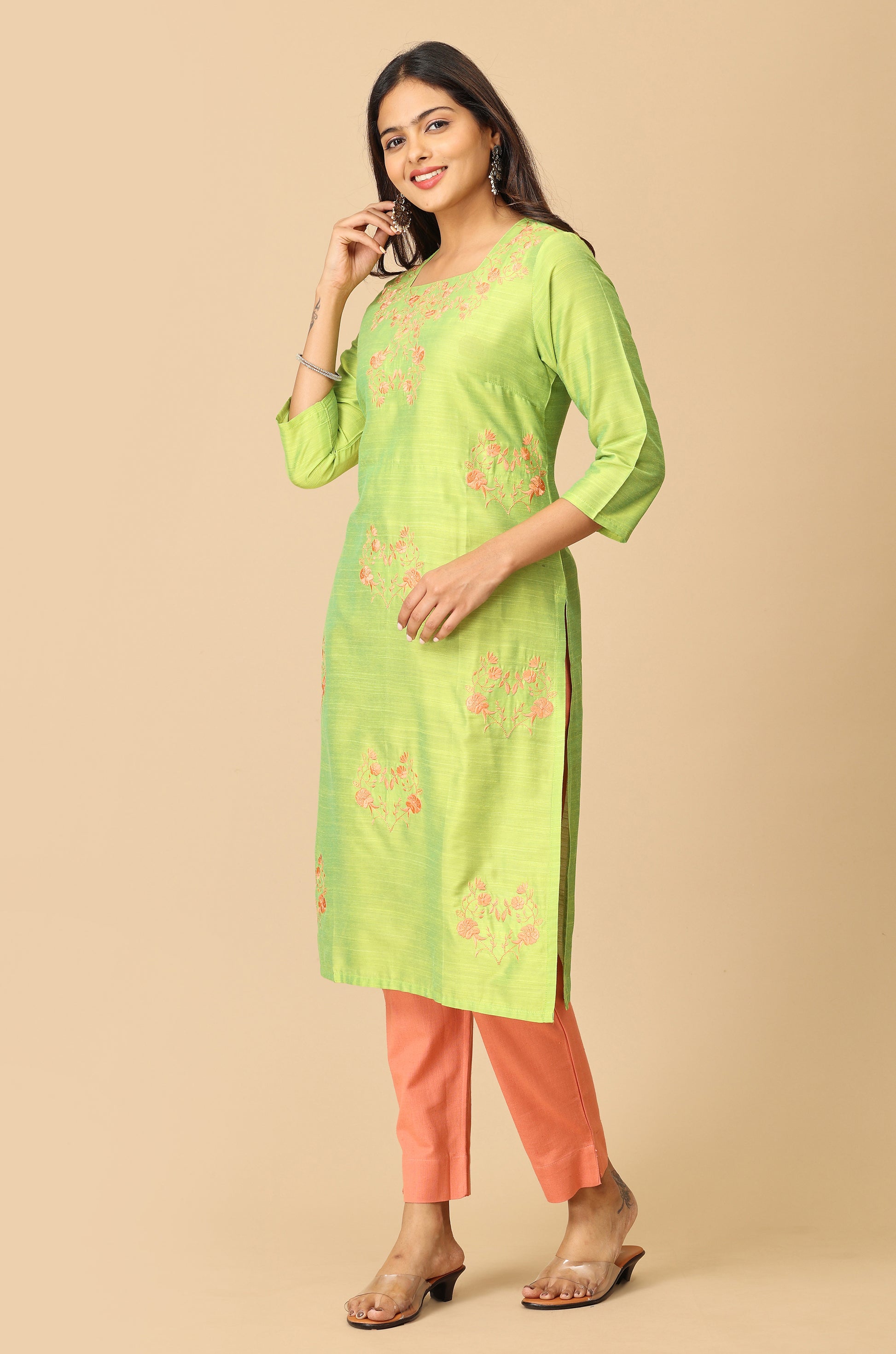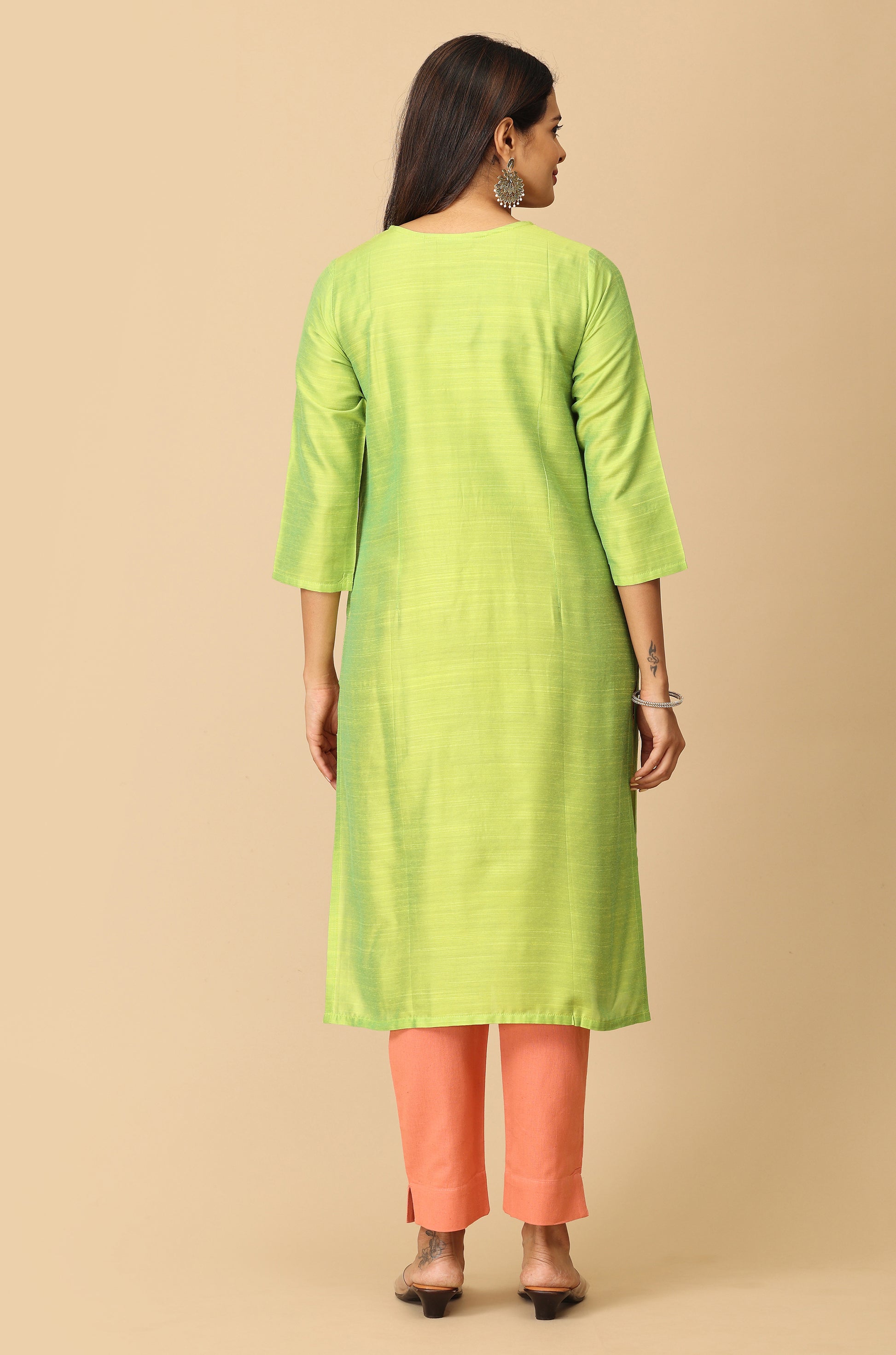 Lime Green Slub Silk All Over Embroidery Kurti