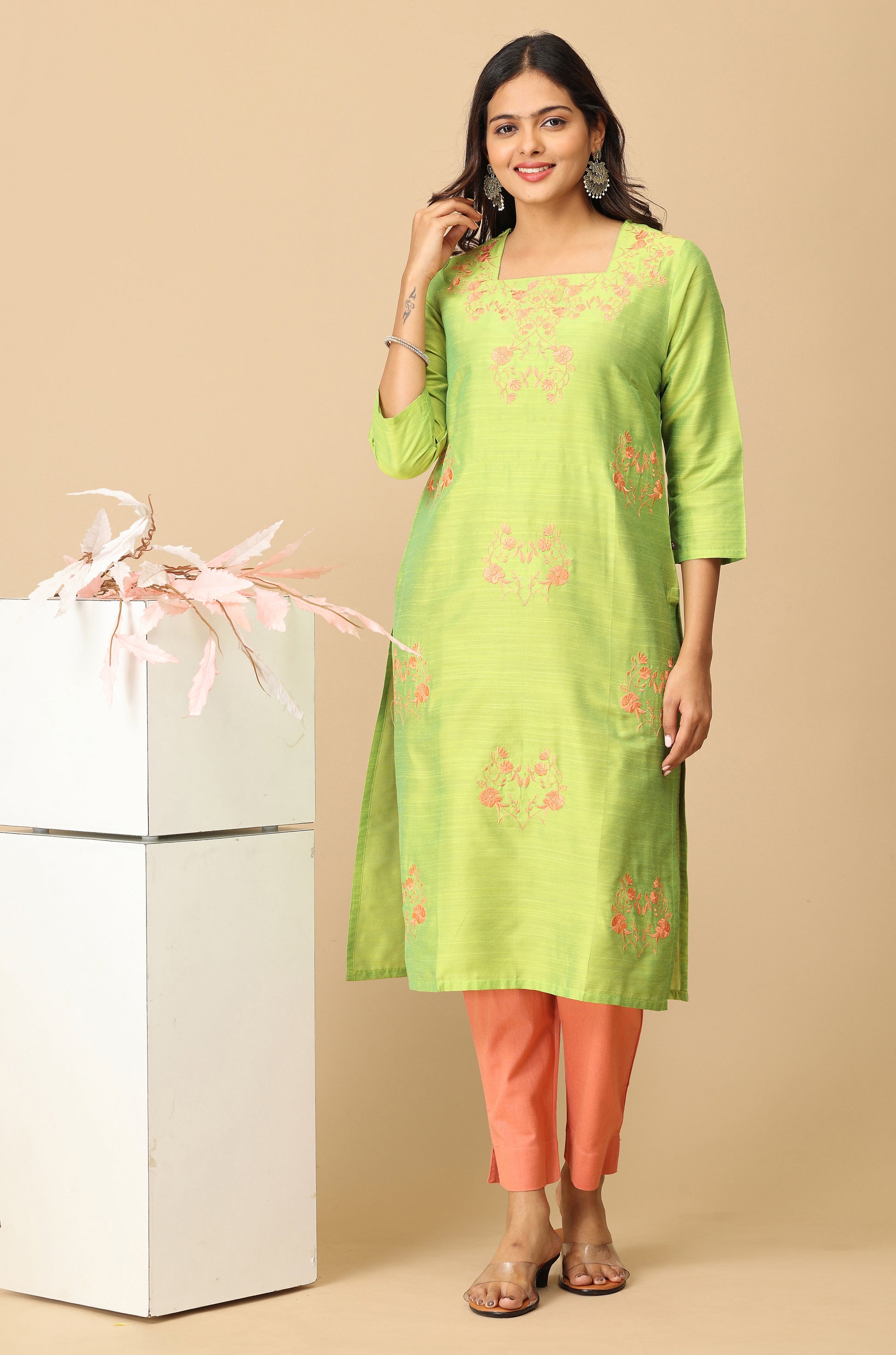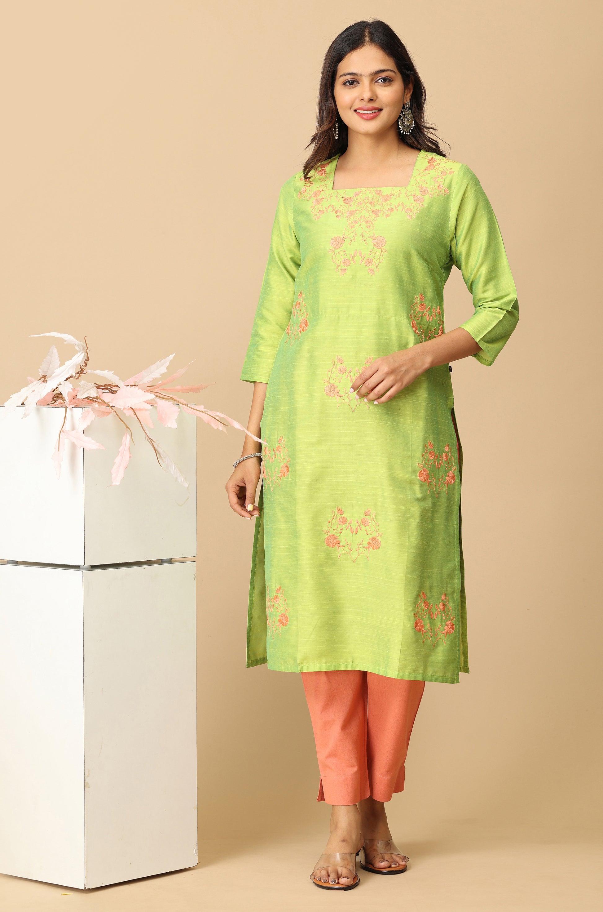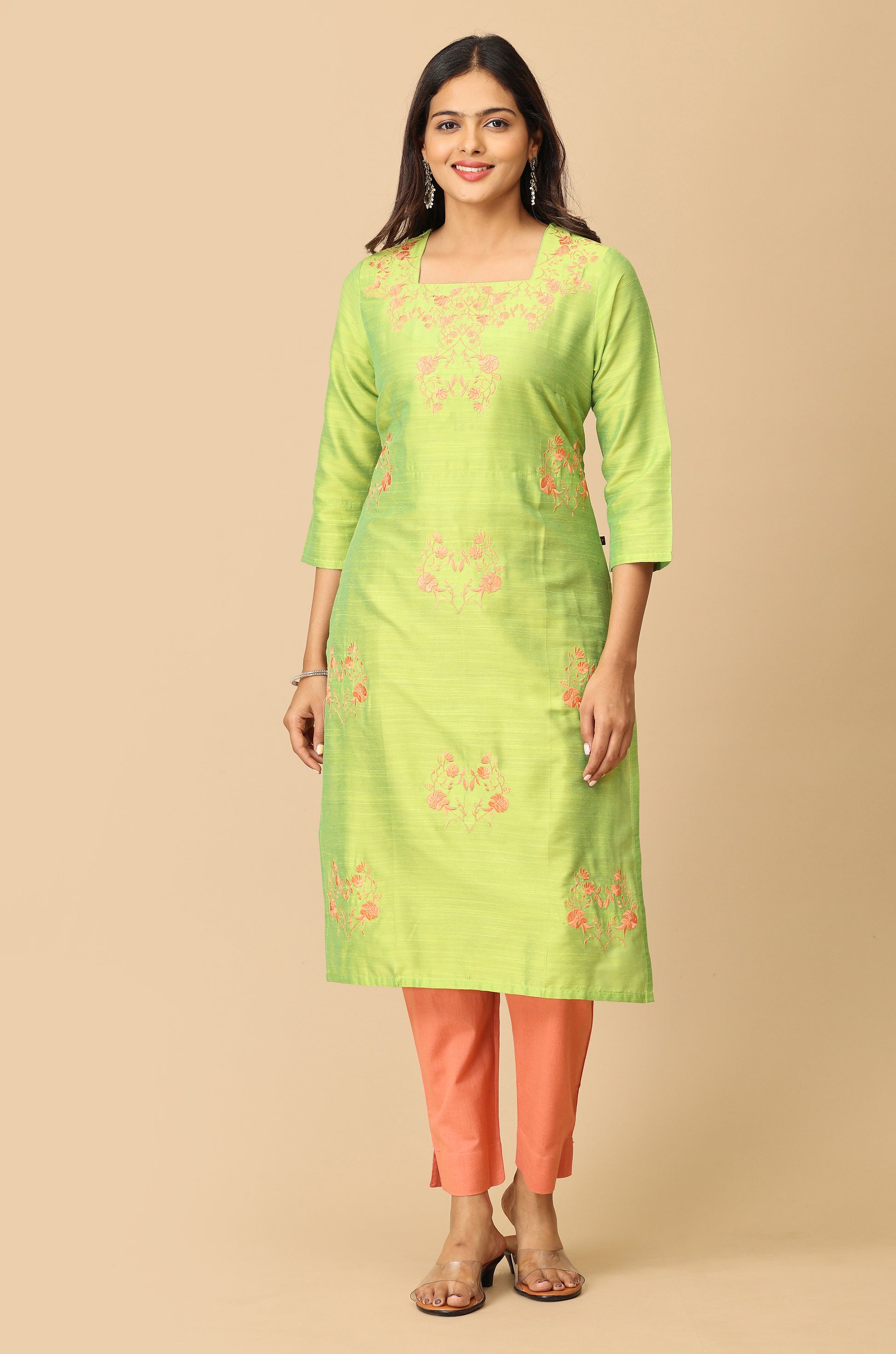 Lime Green Slub Silk All Over Embroidery Kurti