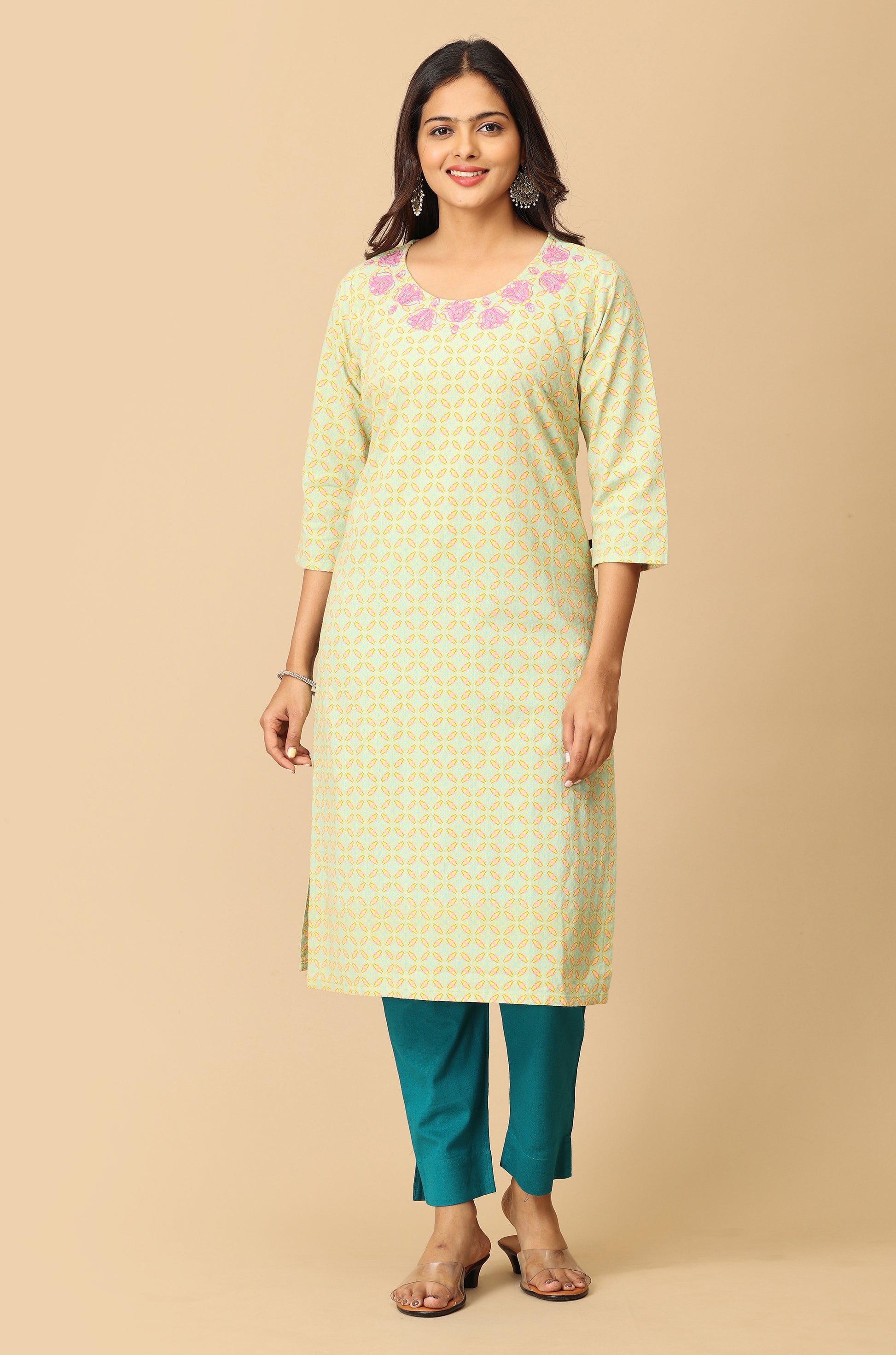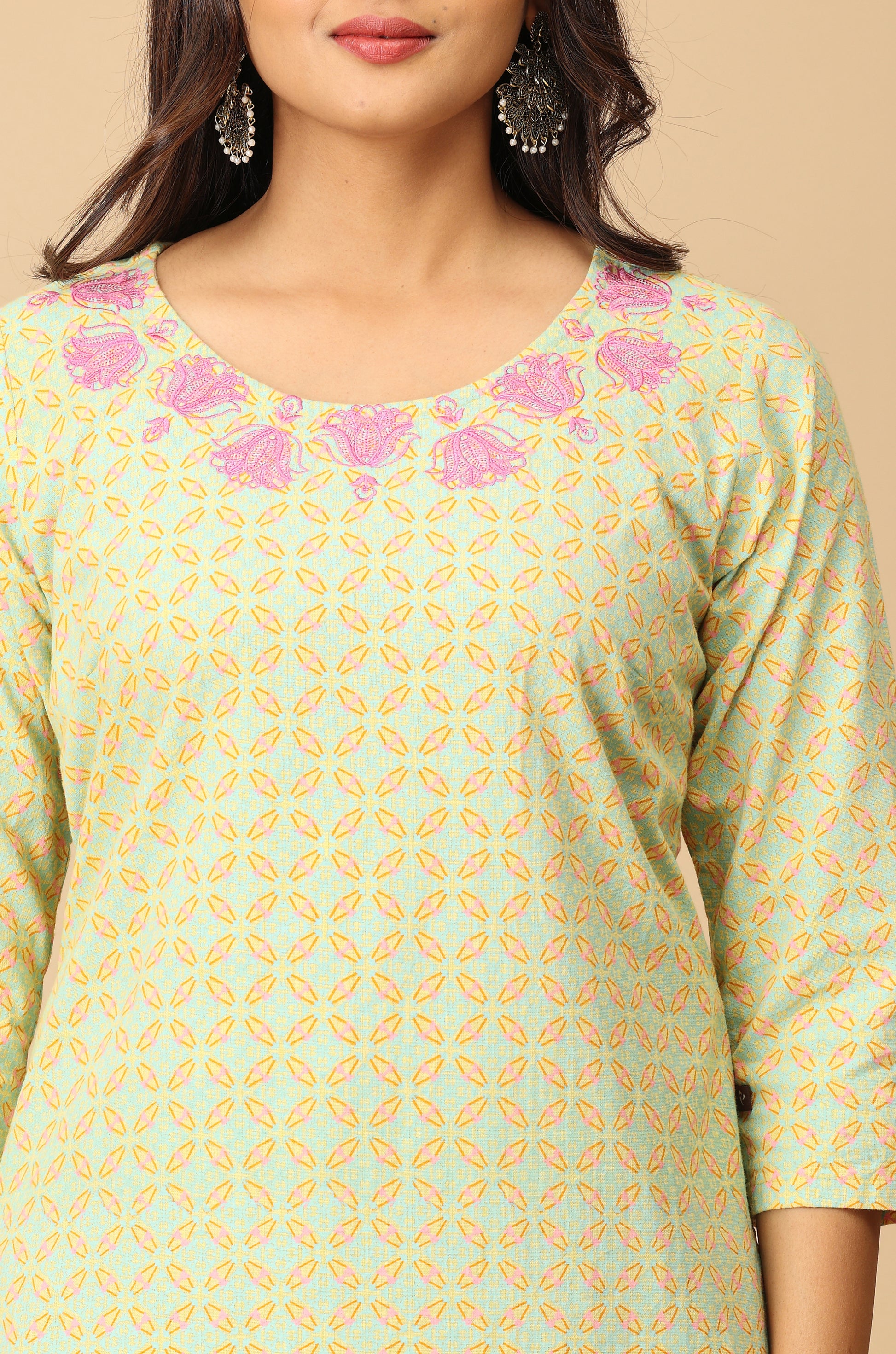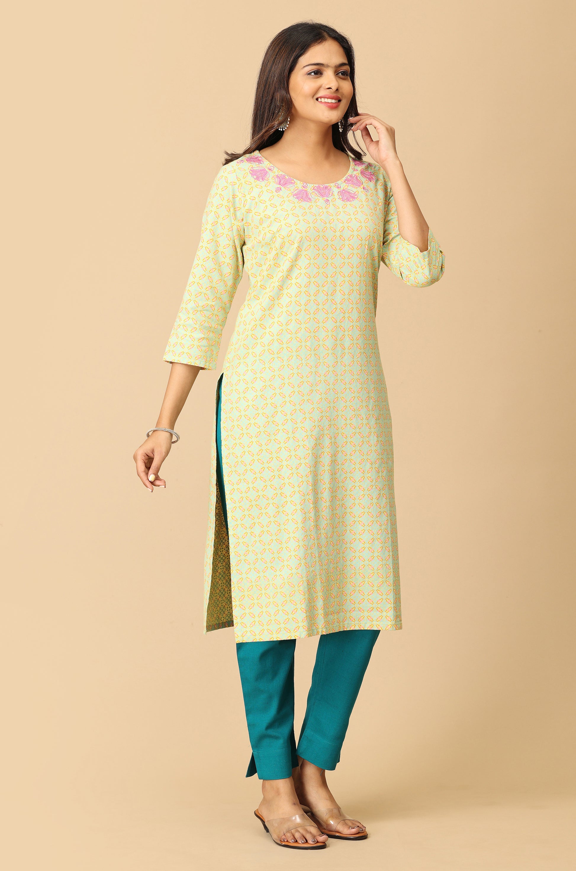 Lemon Khadi Print with Neck Embroidery Kurti