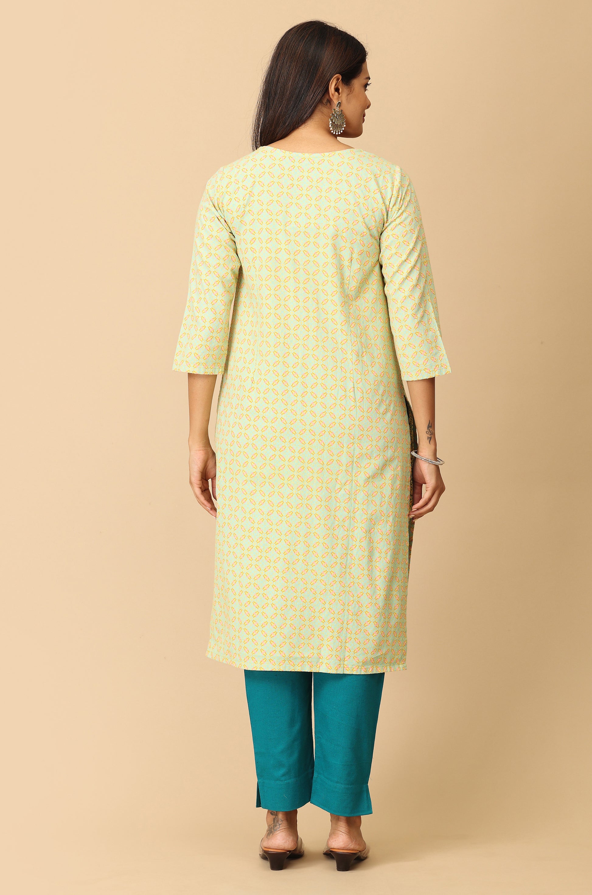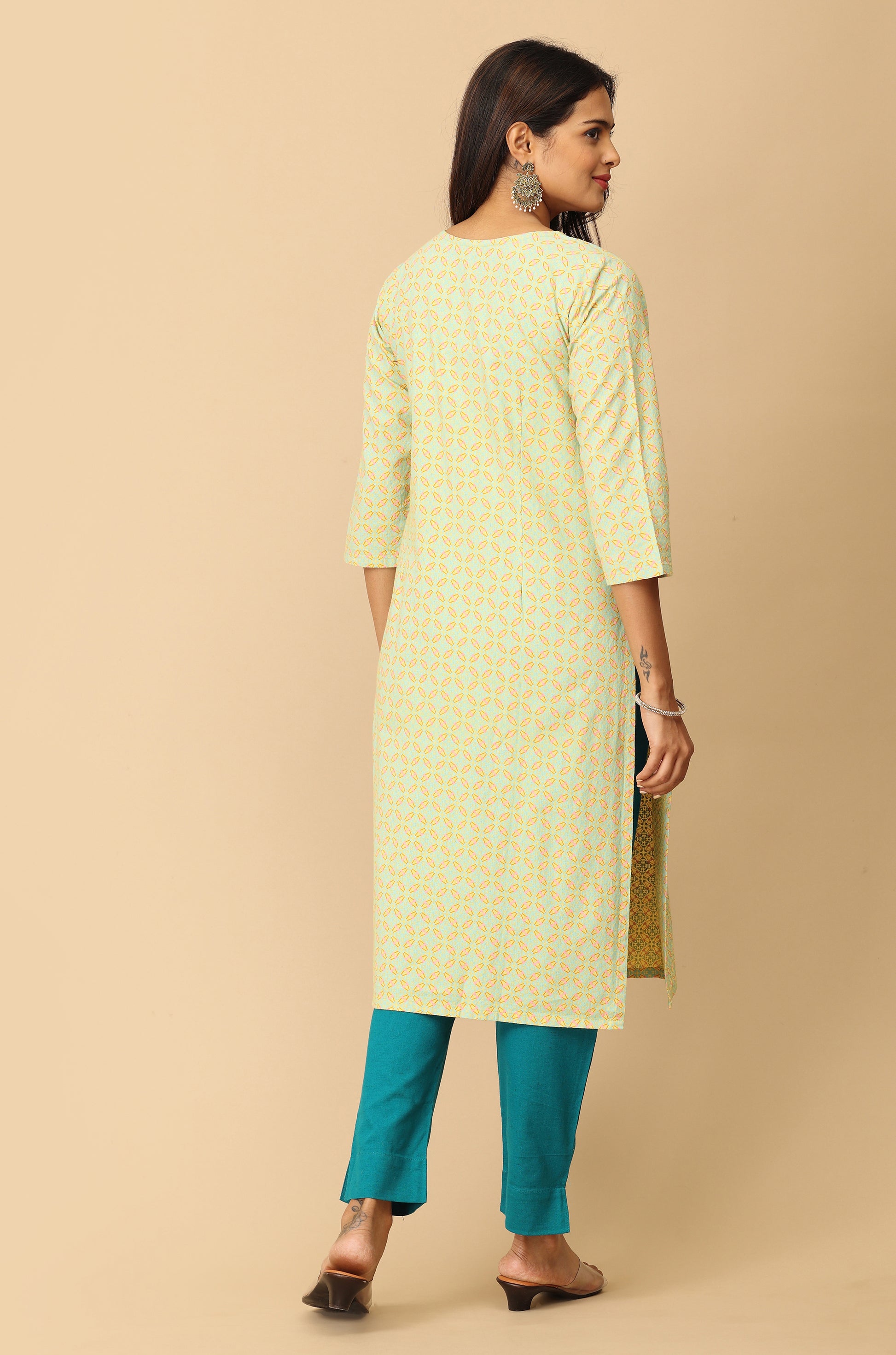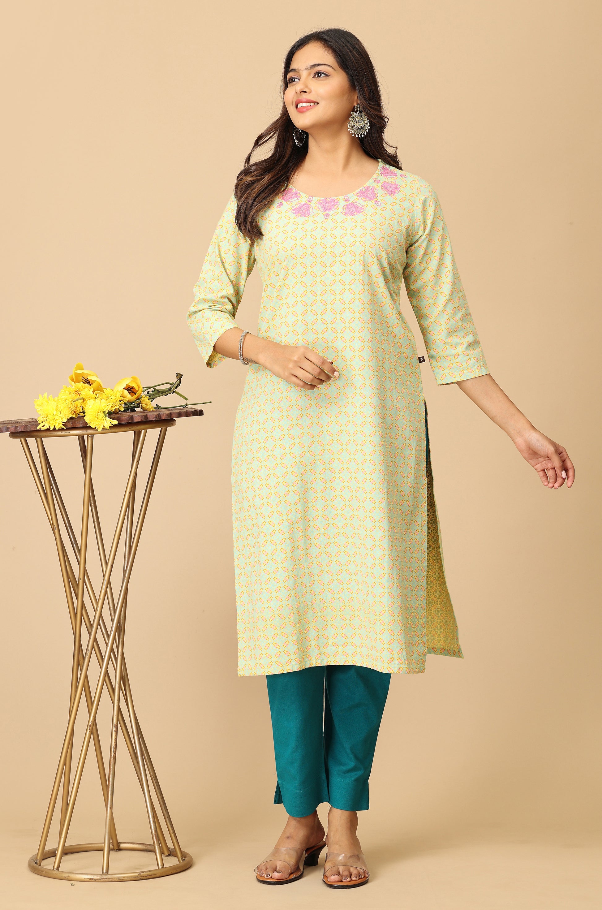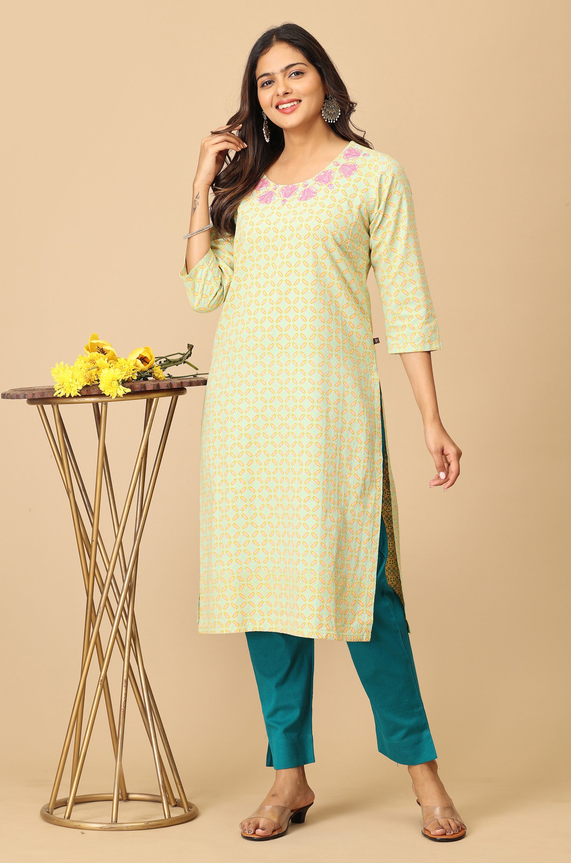 Lemon Khadi Print with Neck Embroidery Kurti