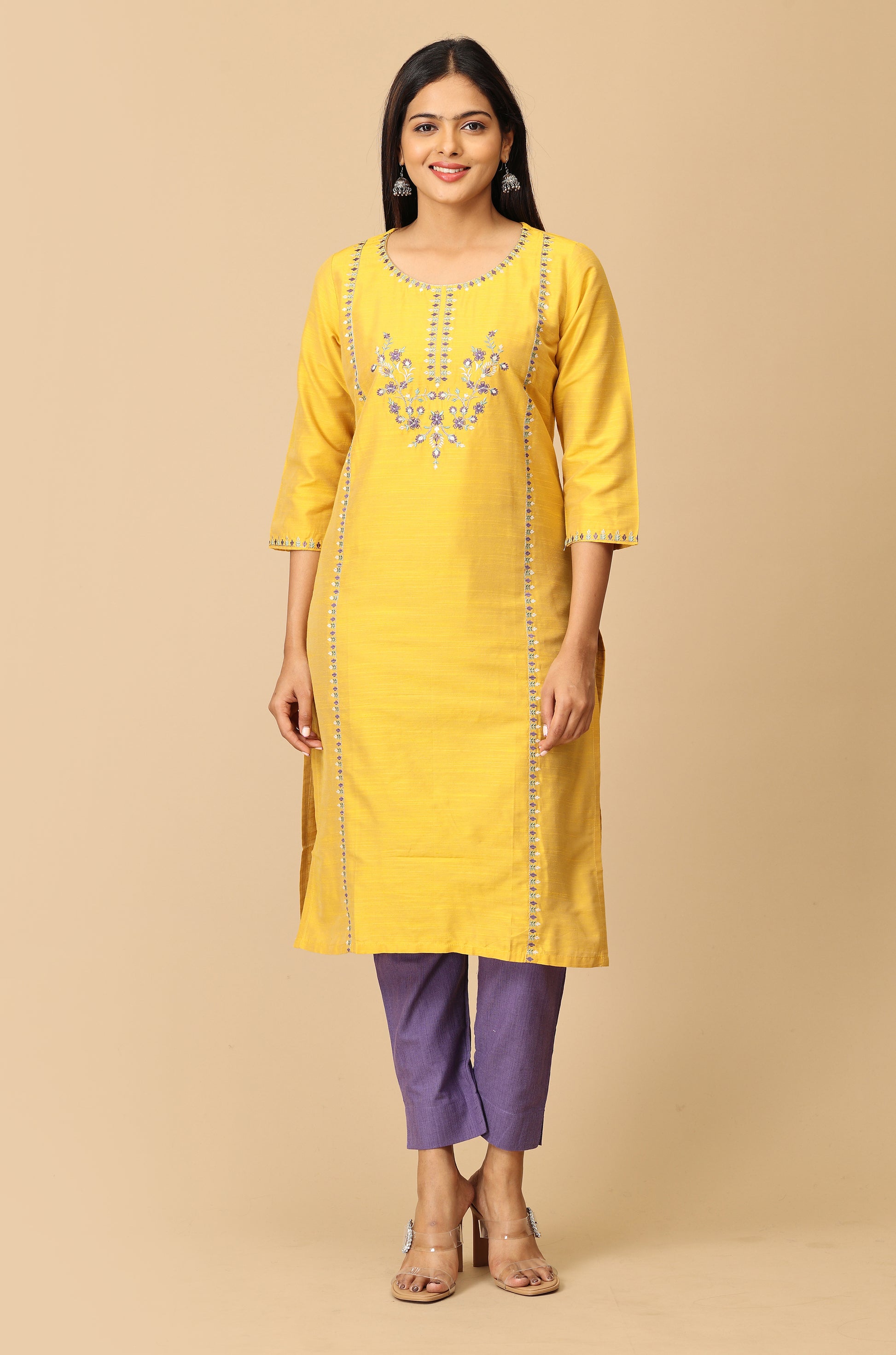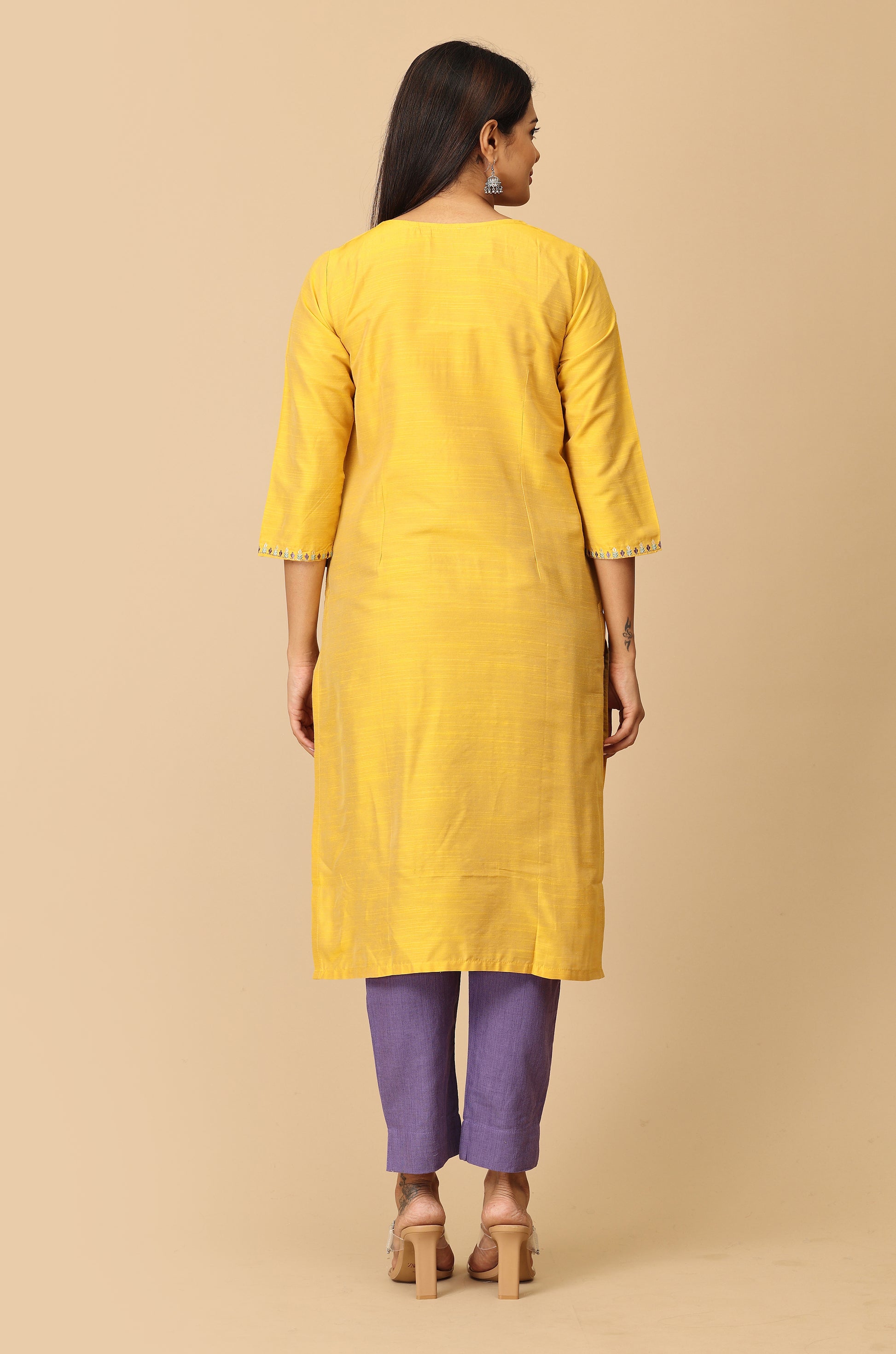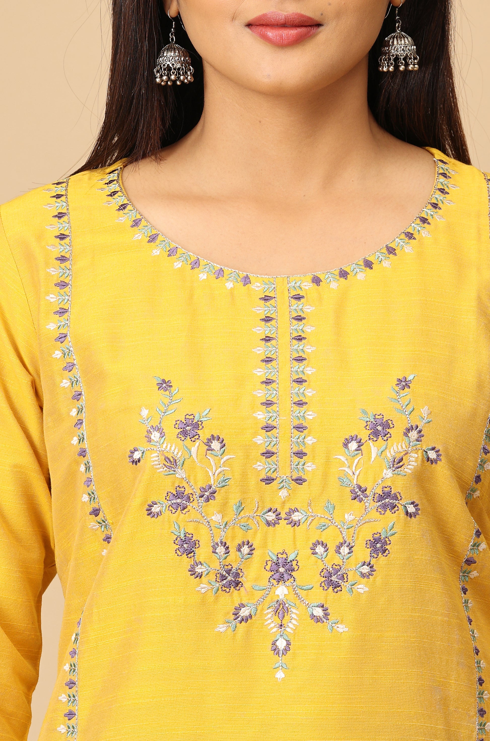 Yellow Slub Silk Embroidery Kurti