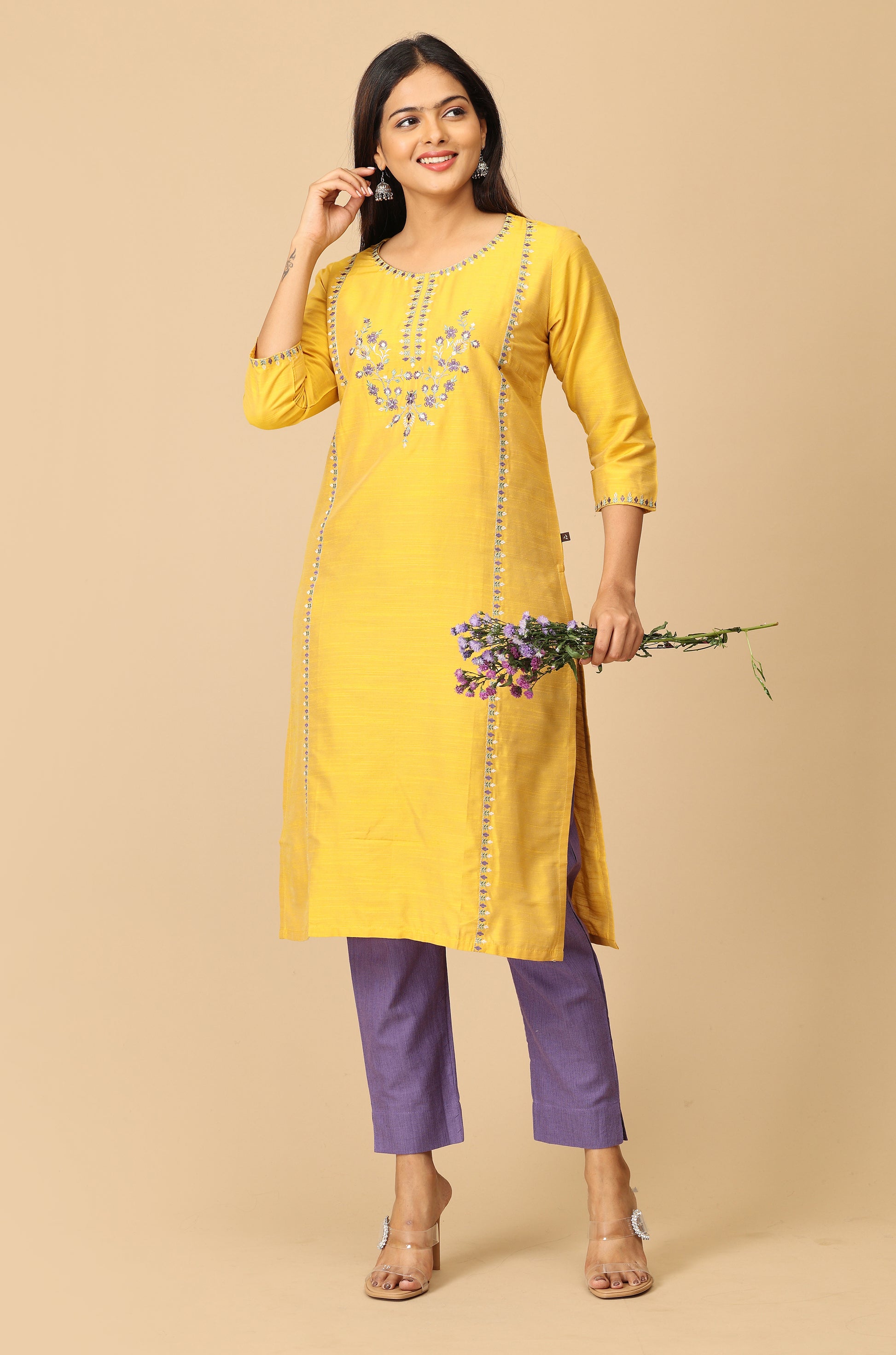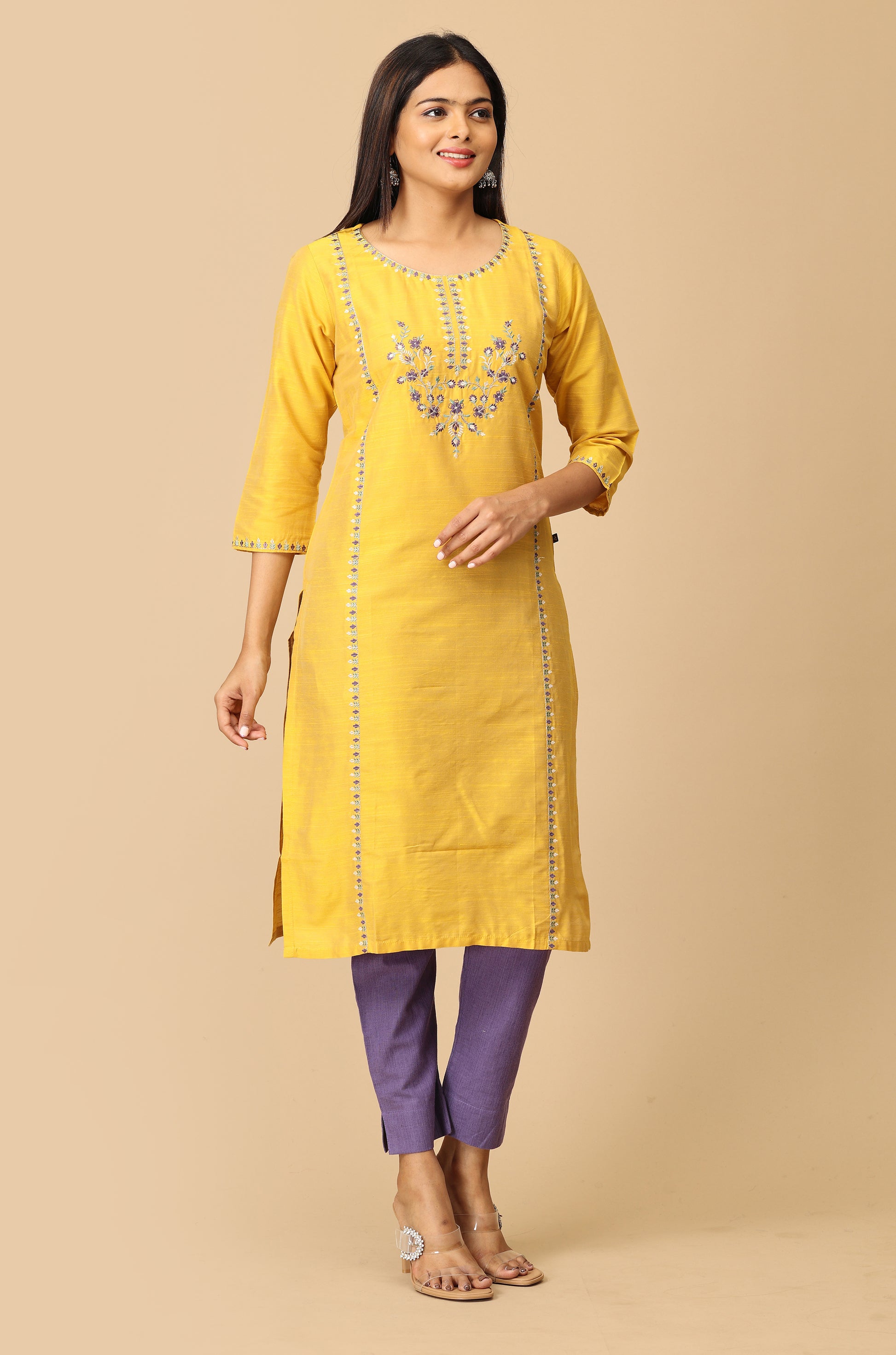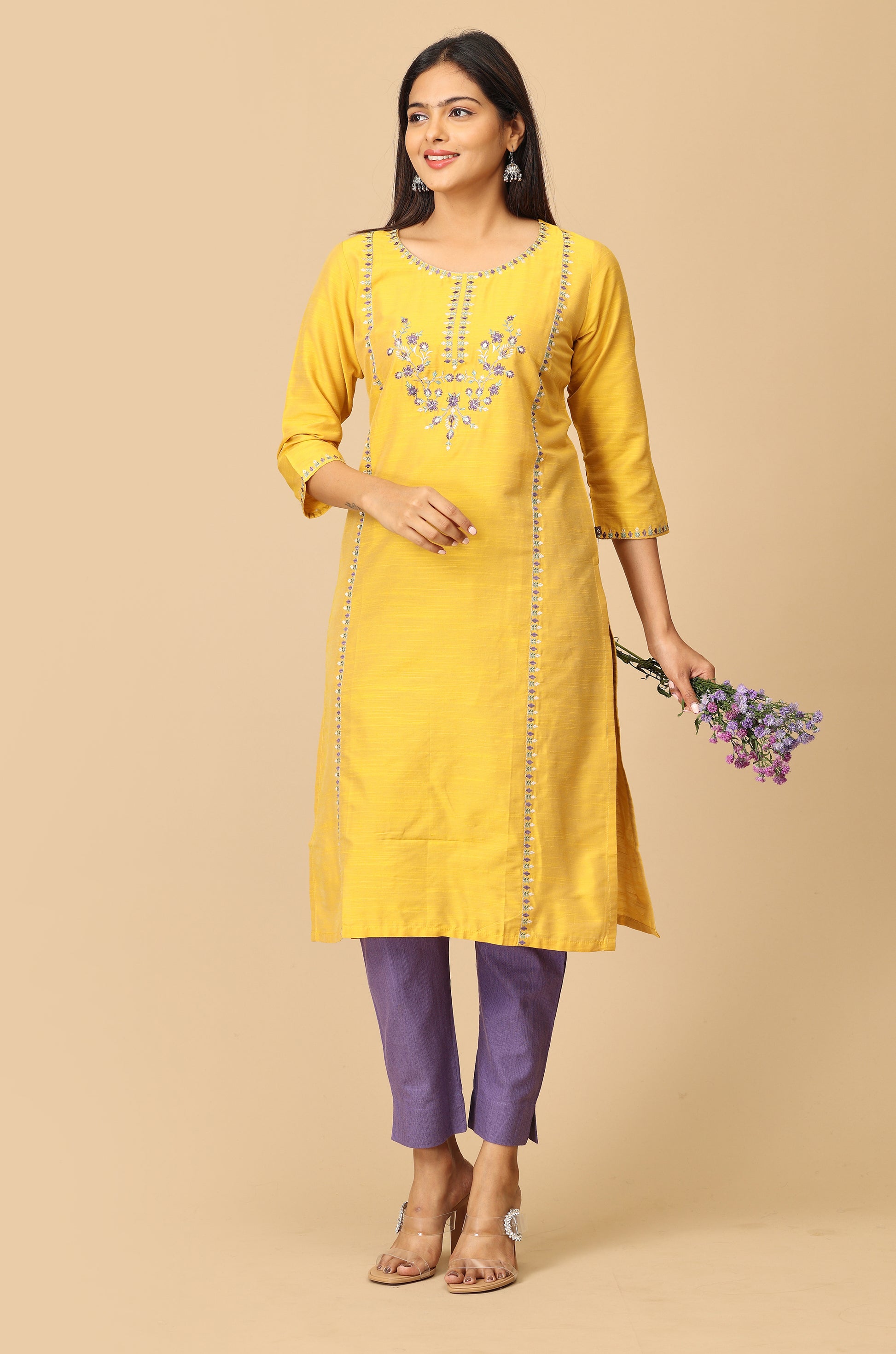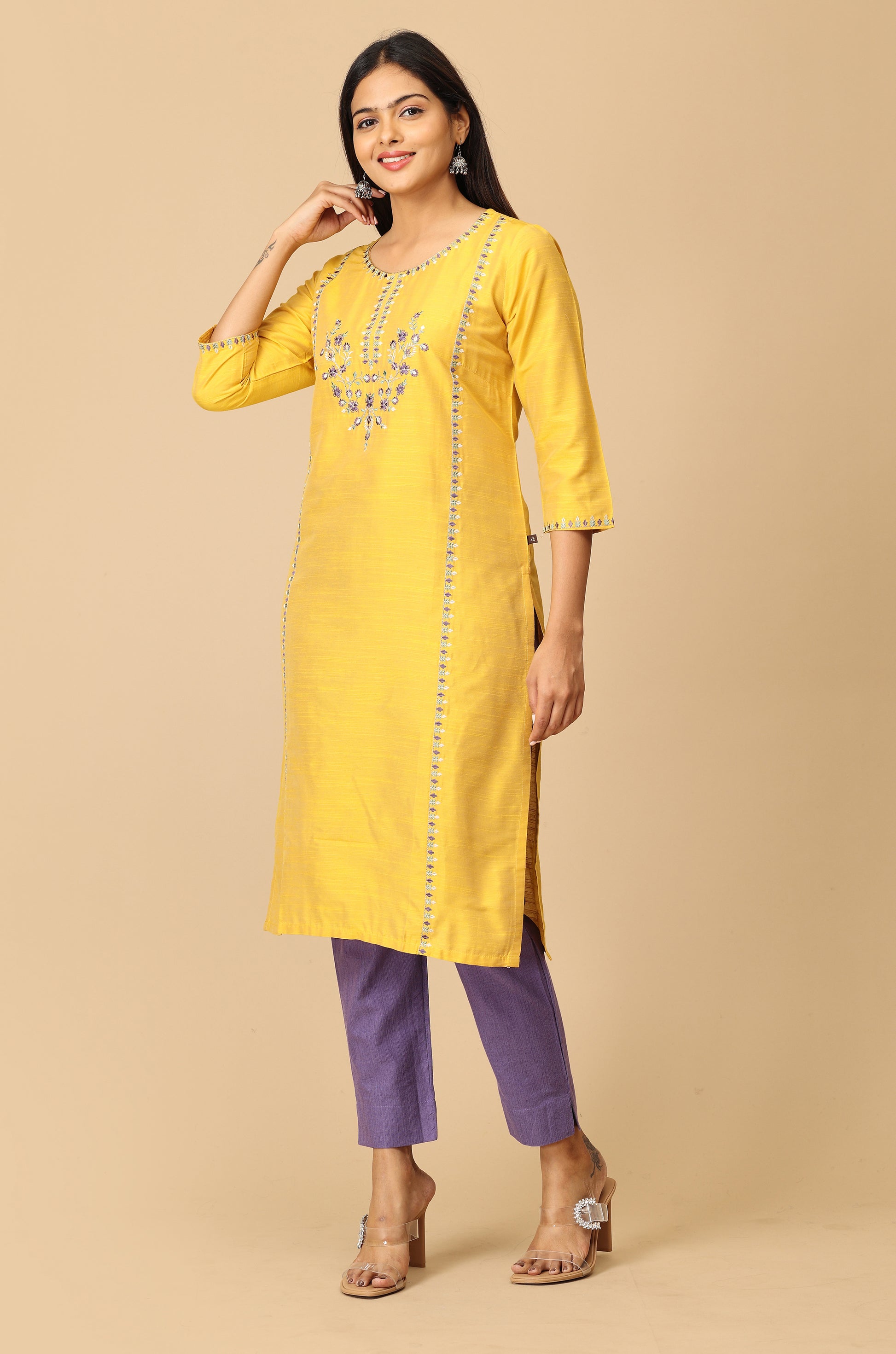 Yellow Slub Silk Embroidery Kurti